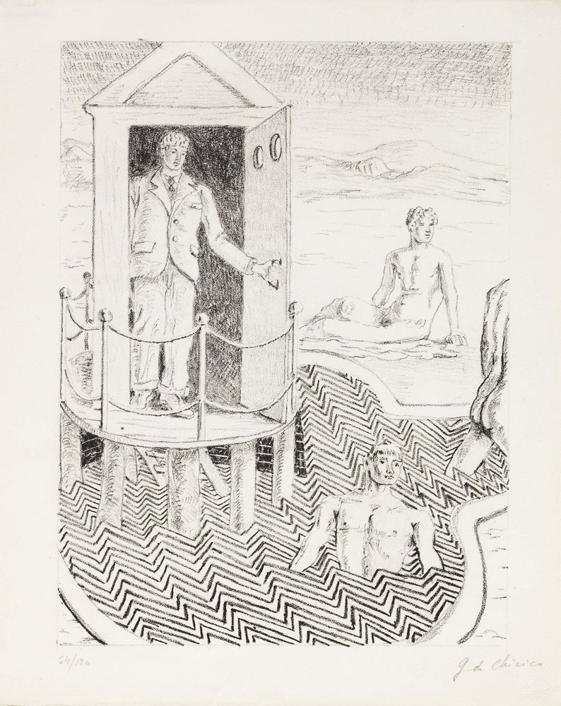 Giorgio de Chirico, Volos 1888 - Roma 1978, Nella piscina inquietante, 1934, Litografia, es. 54/120, cm. 24x18 (lastra), cm. 28,5x22,8 (carta), Firma a matita sul margine in basso a destra: G. de Chirico, tiratura in basso a sinistra: 54/120: in basso a destra timbro a secco Libreria / Prandi / Reggio E., Dalla cartella Mythologie (Bagni misteriosi), composta da 10 litografie, Éditions des Quatre Chemins, Parigi, stampatore Edmond Desjobert, Parigi, tiratura di 120 esemplari in numeri arabi e 10 esemplari fuori commercio., Bibliografia: Alfonso Ciranna, Giorgio de Chirico, catalogo delle opere grafiche (incisioni e litografie) 1921-1969, A. Ciranna Ed. Milano - Ed. La Medusa, Roma, 1969, p. 115, n. 90;, Antonio Vastano, Giorgio de Chirico. Catalogo dell'opera grafica 1921-1969, Edizioni Bora, Bologna, 1996, p. 147, n. 99
