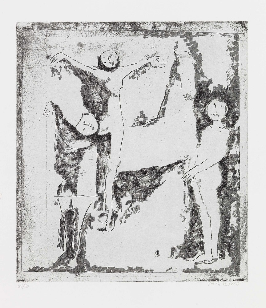 Marino Marini, Pistoia 1901 - Viareggio (Lu) 1980, Gruppo di Arlecchini, 1968, Acquaforte, es. 45/50, cm. 41,3x36,5 (lastra), cm. 65x50 (carta), Firma a matita sul margine in basso a destra: Marino, tiratura in basso a sinistra: 45/50., Tiratura di 50 esemplari in numeri arabi, 30 in numeri romani e alcune prove d'artista; edizioni Toninelli Arte Moderna, Milano., Bibliografia: Guido Guastalla, Giorgio Guastalla, Marino Marini. Catalogo ragionato dell'Opera grafica (Incisioni e Litografie) 1919-1980, Edizioni Graphis Arte, Livorno, 1990, pp. 68, 209, n. A90