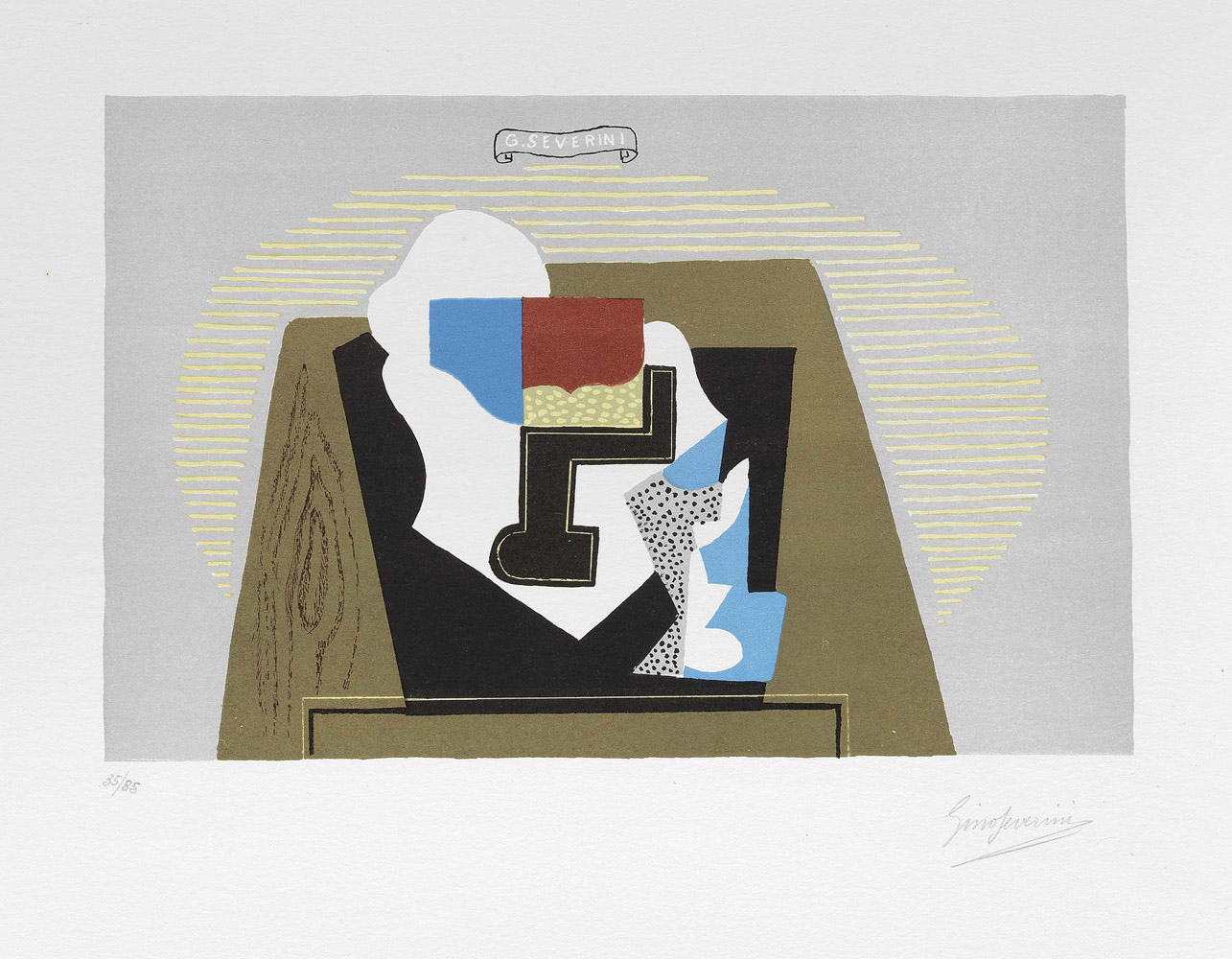 Gino Severini, Cortona (Ar) 1883 - Parigi 1966, Natura morta con fruttiera e bicchiere, 1964-65, Litografia, es. 35/85, cm. 17,8x27,7 (lastra), cm. 36,7x49,5 (carta), Firma in lastra in alto al centro: Severini, firma a matita sul margine in basso a destra: Gino Severini, tiratura in basso a sinistra: 35/85., Certificato Il Bisonte stamperia d'arte grafica contemporanea, Firenze., Tiratura di 85 esemplari in numeri arabi e 25 in numeri romani; stampatore Rodolfo Margheri, Firenze, editore Il Bisonte, Firenze., Bibliografia: Francesco Meloni, Gino Severini. Tutta l'opera grafica, Libreria Prandi, Reggio Emilia, 1982, pp. 110, 111, n. 47
