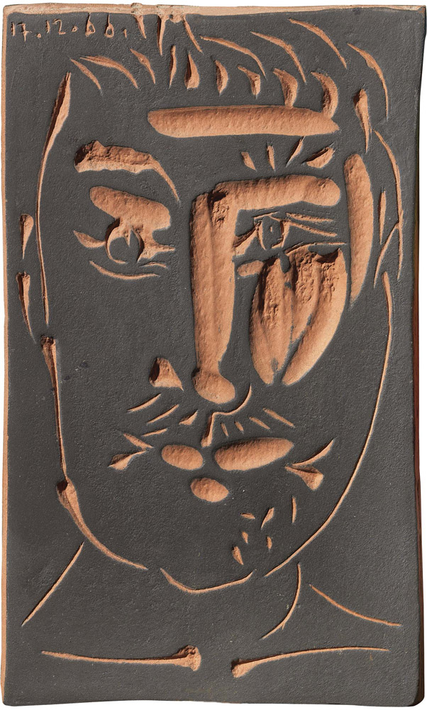 Pablo Picasso, Malaga 1881 - Mougins 1973, Visage d'homme, 1966, Bassorilievo in terracotta, es. 135/500, cm. 16,2x10,2, Data in alto a sinistra: 17.12.66; al retro: tiratura 135/500: timbro Madoura / Plein Feu: timbro Empreinte / originale de Picasso., Tiratura di 500 esemplari numerati., Bibliografia: Alain Ramié, Picasso. Catalogue de l'oeuvre céramique édité 1947-1971, Ediz. Galerie Madoura, Vallauris, 1988, p. 268, n. 539
