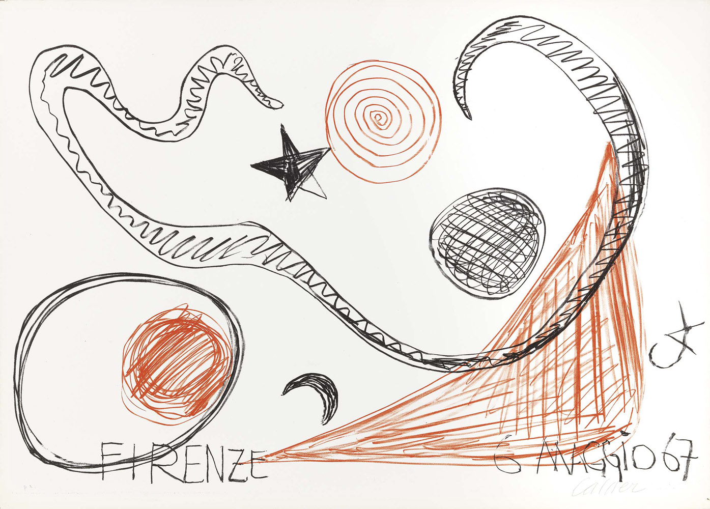 Alexander Calder, Philadelphia 1898 - New York 1976, Firenze - 1967, 1967, Litografia, es. p.a., cm. 55,5 x74 (carta), Firma a matita sul margine in basso a destra: Calder, tiratura un basso a sinistra: p.a., Tiratura di 80 esemplari, 40 in rosso e 40 in nero, a colori invertiti; stampatore Il Bisonte, Firenze