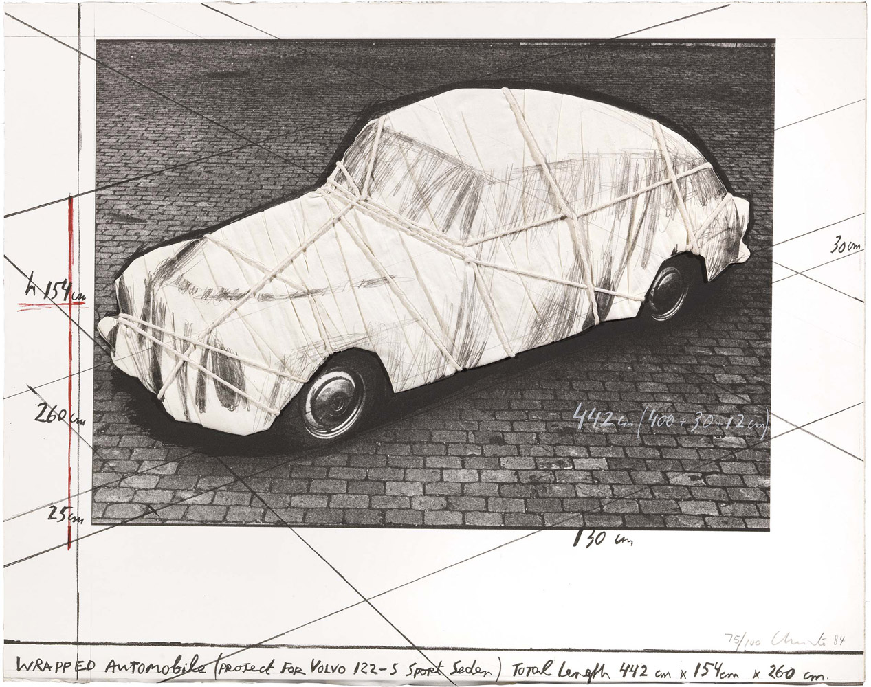 Christo, Gabrovo 1935, Wrapped Automobile Volvo, 1984, Collage 3D e litografia, es. 75/100, cm. 56,4x71, Tiratura, firma e data a matita in basso a destra: 75/100 Christo 84. Al verso, su un cartone di supporto: timbro Copyright 1958 / Christo, con n. Cj - 85-884 a matita: numero 19521 a matita: etichetta Galleria ModenArte, Modena., Tiratura di 100 esemplari in numeri arabi, 20 in numeri romani e 20 A.P., stampatore Landfall Press, Chicago, editore Christo and Edition Schellmann, Monaco/New York., Bibliografia: Christo and Jeanne-Claude, Schumacher, Edition Fils., Düsseldorf p. 57, n. 19521;, Christo prints and objects, 1963-1987 a catalogue raisonné edited by Jörg Schellmann & Josephine Benecke, Edition Schellmann, Monaco / Abbeville Press, New York 1988, p. 149, n. 113
