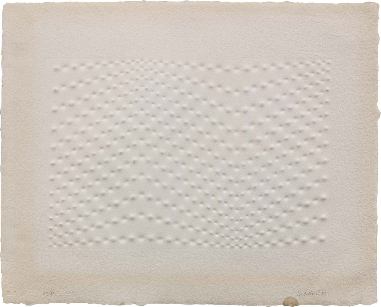 Enrico Castellani, Castelmassa (Ro) 1930, Senza titolo, 1972, Rilievo a secco su carta, multiplo, es. 27/50, cm. 43x54, Firma e data a matita sul margine in basso a destra: Castellani 72, tiratura in basso a sinistra: 27/50. Su un cartone di supporto: etichetta [...] e Colophon, con dati dell'opera