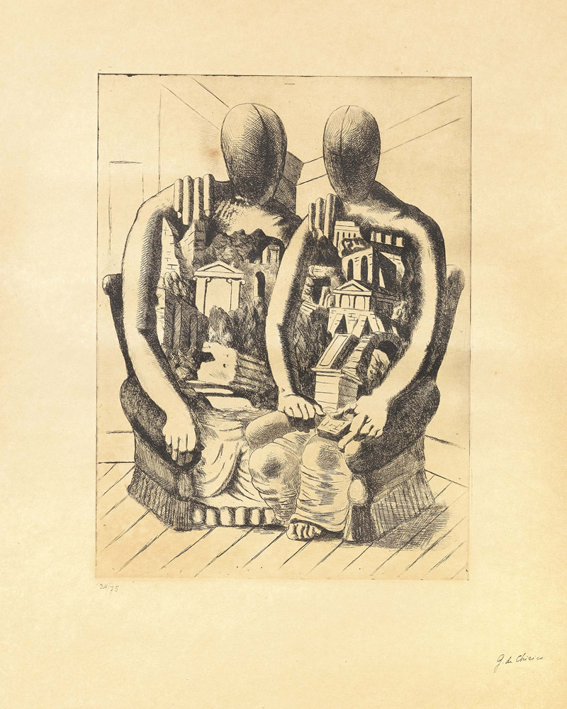 Giorgio de Chirico, Volos 1888 - Roma 1978, Gli Archeologi II, 1927, Acquaforte, es. 24/75, cm. 33,5x24,5 (lastra), cm. 61,3x47,6 (carta), Firma a penna sul margine in basso a destra: G. de Chirico, tiratura a matita in basso a sinistra: 24/75: timbro a secco con sigla GM., Tiratura di 75 esemplari in numeri arabi, una prova d'artista, Edizione Graphica Nova, Milano, 1927., Bibliografia: Alfonso Ciranna, Giorgio de Chirico, catalogo delle opere grafiche (incisioni e litografie) 1921-1969, A. Ciranna Ed. Milano - Ed. La Medusa, Roma, 1969, p. 17, n. 2;, Antonio Vastano, Giorgio de Chirico. Catalogo dell'opera grafica 1921-1969, Edizioni Bora, Bologna, 1996, p. 27, n. 2 e in copertina