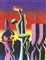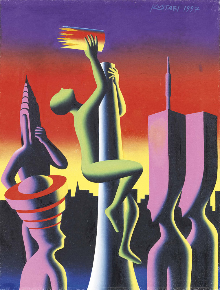 Mark Kostabi, Los Angeles 1960, The Crowning Archievement (Sunset Glory), 1997, Olio su tela, cm. 60,5x45,5, Firma e data in alto a destra: Kostaby 1997; al verso sulla tela: Kostabi / The Crowning Archievement (Sunset Glory) 1997 / 3.12.97. ARACNIDAN., Storia: Opera acquistata direttamente dall'artista; Collezione privata, Foto autenticata dall'artista, Archivio delle opere del maestro Mark Kostabi, con n. 76