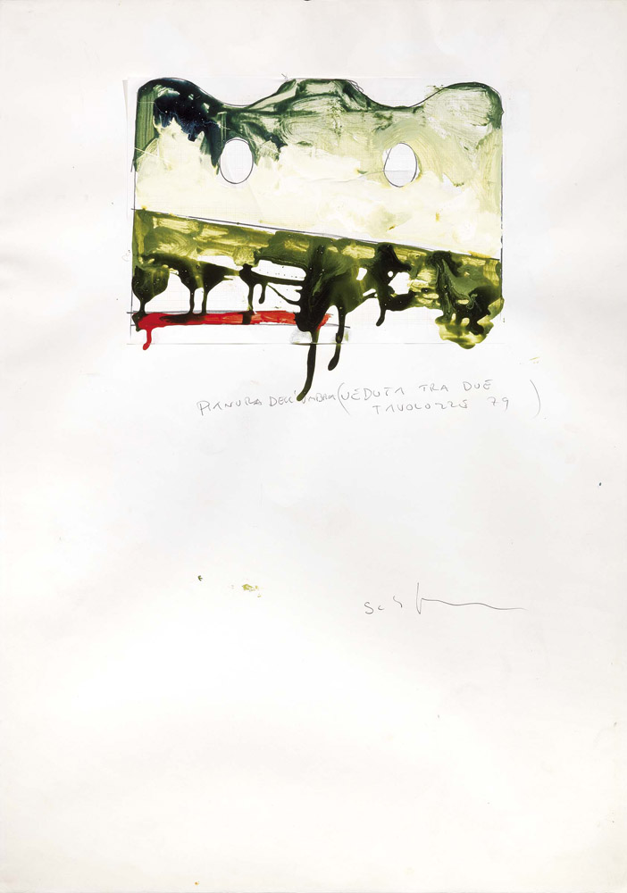 Mario Schifano, Homs 1934 - Roma 1998, Pianura dell'Umbria (Veduta tra due tavolozze), 1979, Smalto e collage su carta, cm. 100x70, Titolo, data e firma in basso a destra: Pianura dell'Umbria (Veduta tra due tavolozze 79) / Schifano., Certificato con foto Archivio Mario Schifano, Roma, 17 aprile 2009, con n. 01387090103