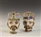 Coppia di caraffe in maiolica dipinta in policromia, a raffigurare personaggi...