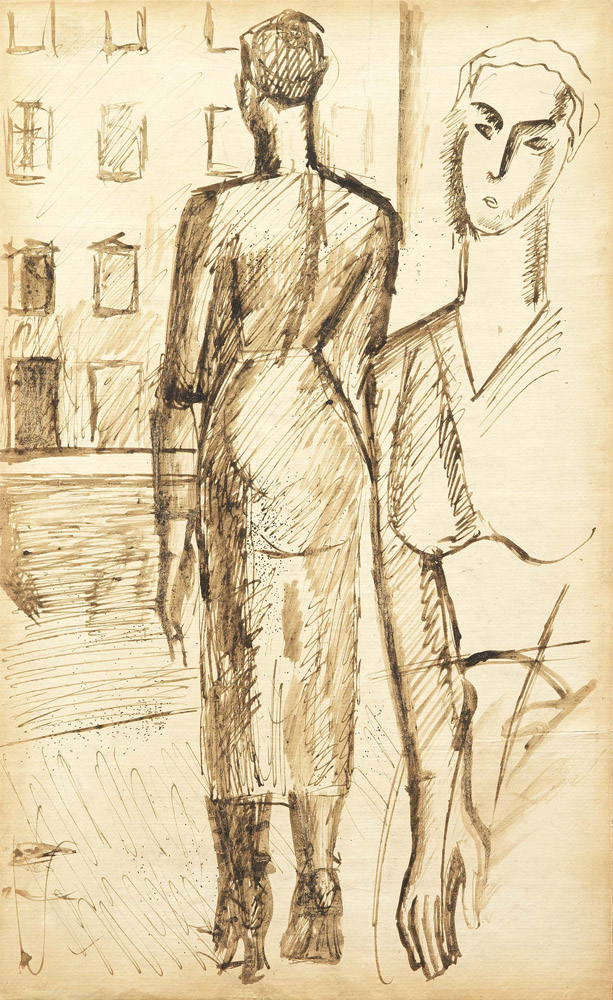 Mario Sironi, Sassari 1885 - Milano 1961, Modella, (1921), China su carta applicata su tela, cm. 34x20,8, Al verso, su una faesite di supporto: timbro ed etichetta con n. 29 Galleria d'Arte Cavour, Milano: timbro Galleria d'Arte Cortina, Milano: ritaglio di giornale con riproduzione dell'opera e indicazione di esposizione presso la Galleria d'Arte Cavour di Milano., Storia: Galleria d'Arte Cavour, Milano; Collezione privata, Bibliografia: Gino Traversi, Mario Sironi. Disegni, illustrazioni scenografie e opera grafica, Casa Editrice Ceschina, Milano, 1968, n. 43