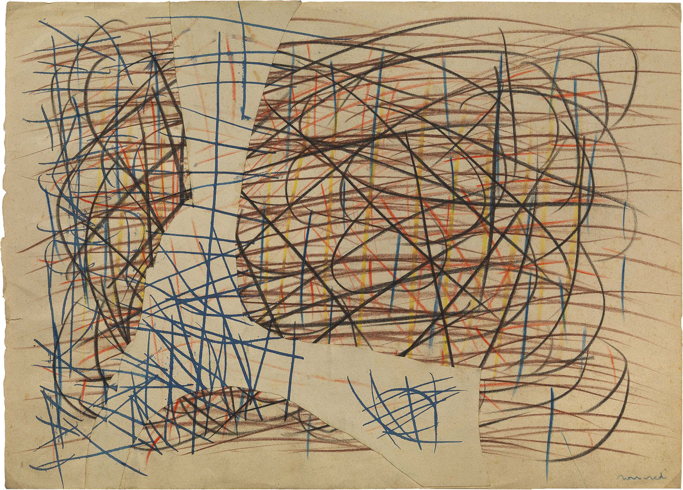Tancredi, Feltre (Bl) 1927 - Roma 1964, Senza titolo, Inchiostro, matite colorate e collage su carta, cm. 24,4x34, Firma in basso a destra: Tancredi., Storia: Collezione Manbert, Firenze; Collezione privata
