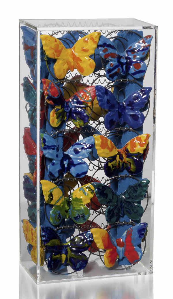 Marcello Lo Giudice - Dalla Primavera del Botticelli - 2010 Molle in acciaio, ceramica e box in plexiglass cm.44x22,5x13. Autentica dell’artista su foto. Opera esposta in “Marcello Lo Giudice / EARTH ARTIST”, mag.-sett. 2011, ABC Arte, Genova. Firma sul retro di una farfalla in alto a destra.