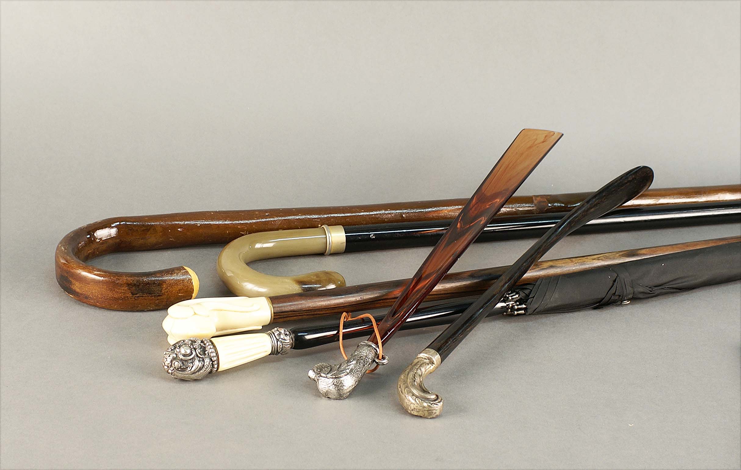 Lotto composto da tre bastoni da passeggio, un ombrello e due calzanti con manici in avorio, argento e metallo.