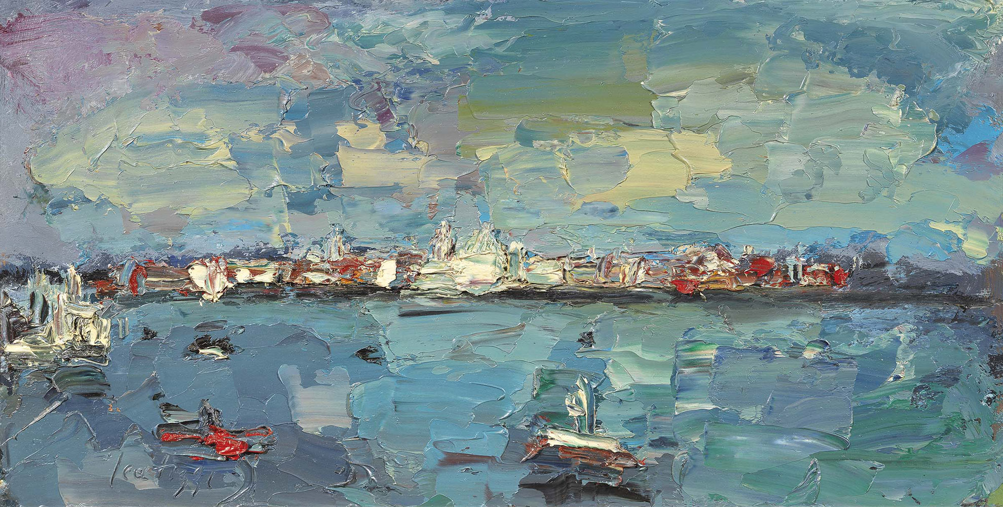 Sergio Scatizzi, Lucca 1918 - Firenze 2009, Laguna, Olio su tavola, cm. 54x104, Firma in basso a sinistra: Scatizzi; firma e titolo al verso: S. Scatizzi fecit / (Laguna)., Foto autenticata dall'artista