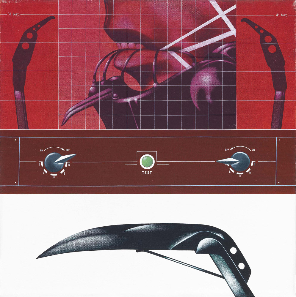 Sergio Sarri, Torino 1938, Test - 31 bat, 1973, Olio su tela, cm. 65x65, Titolo, firma e data al verso sulla tela: "Test - 31 bat" / S. Sarri 1973/VIII: etichetta Galleria d'Arte Maggiolini, Parabiago, con n. 1604., Foto autenticata dall'artista