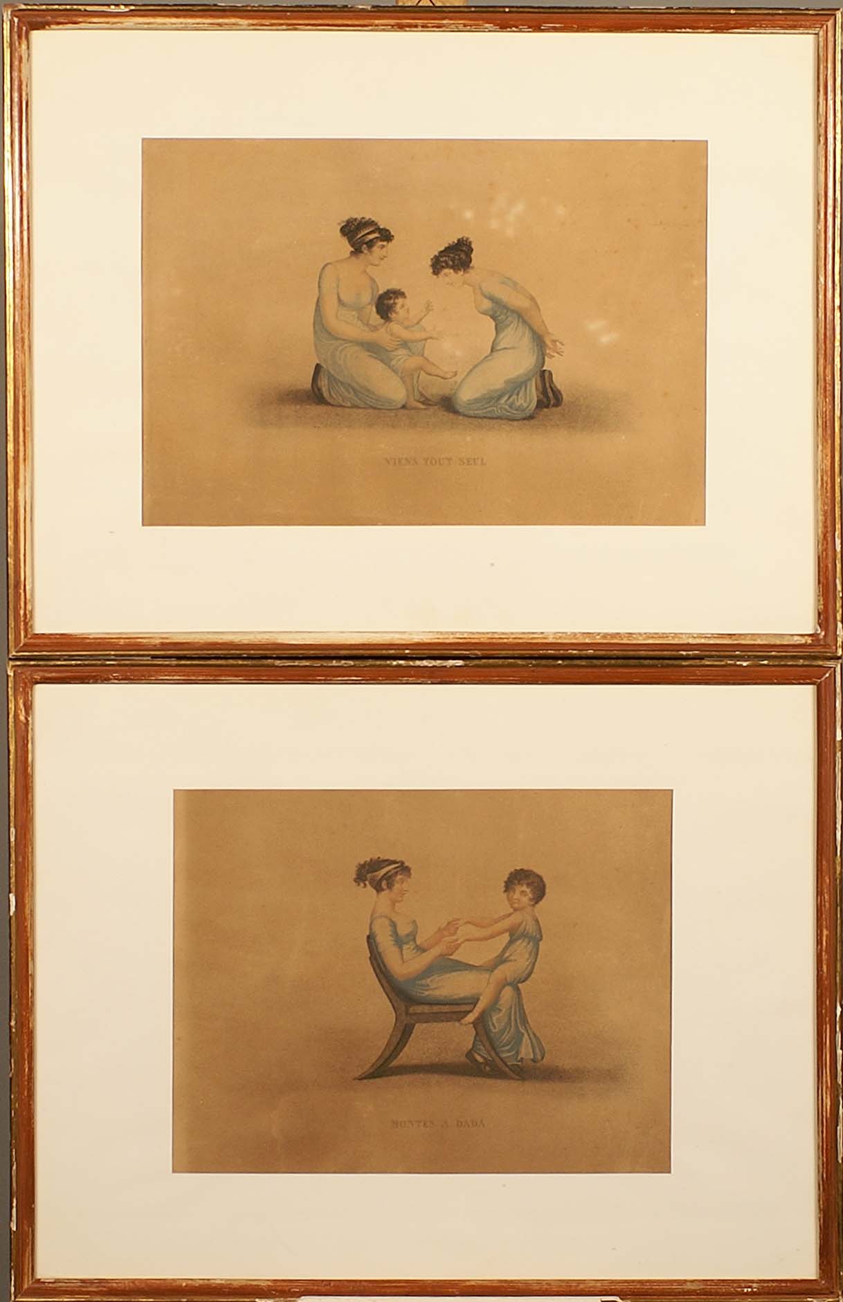 Scuola francese del XIX secolo, "Viens tant seul - Mantes a dada", coppia di stampe, cm. 25x35.