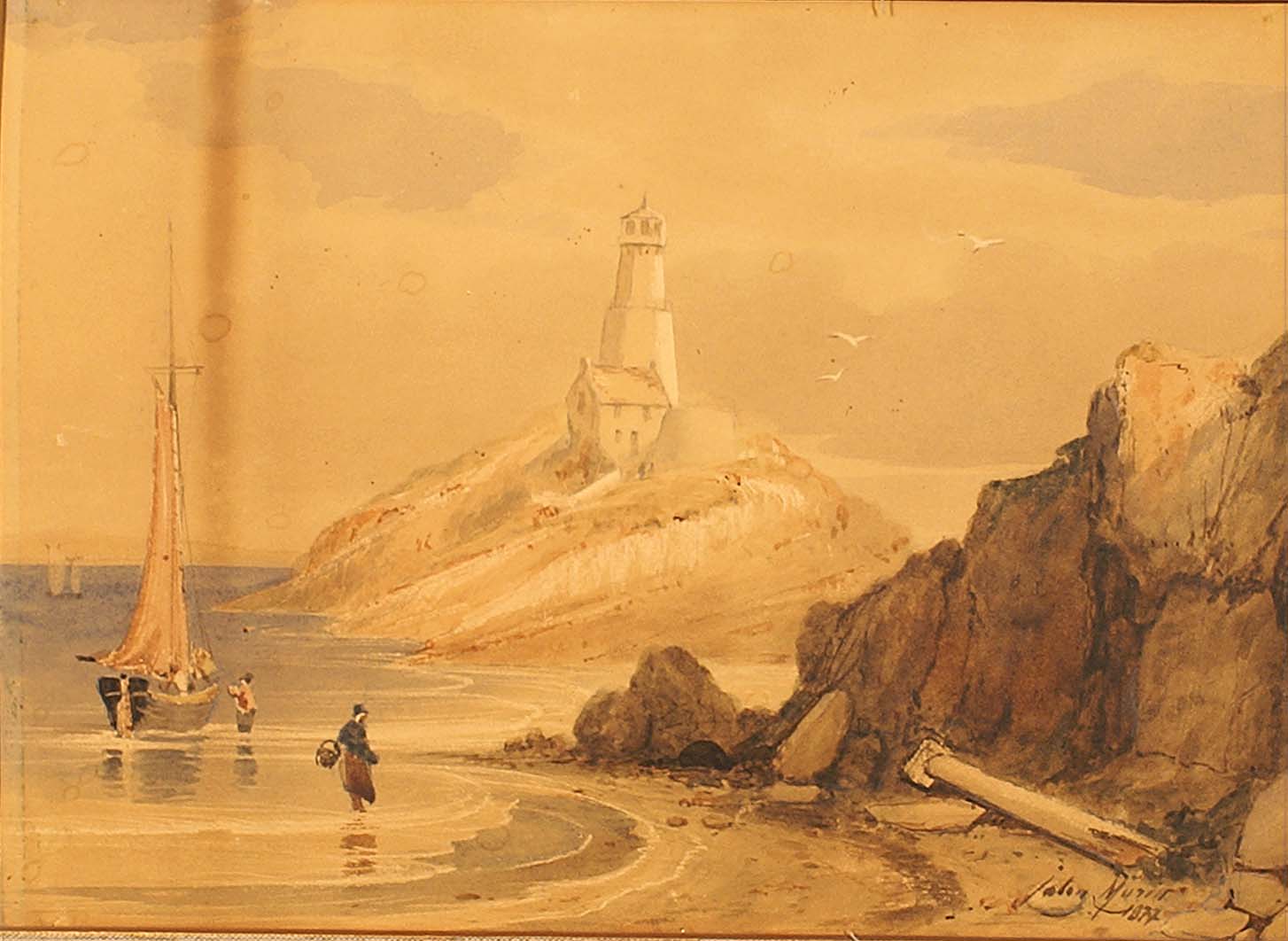 Firma indecifrabile, "Paesaggio marino con faro", acquarello su cartoncino firmato e datato 1877 in basso a destra.