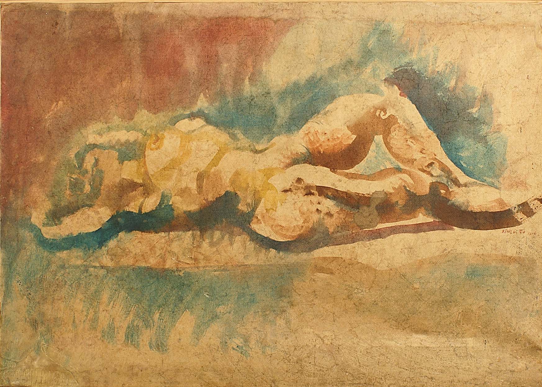 Silvio Benedetto (Buenos Aires 1938), "Nudo sdraiato", tecnica mista su tela, cm. 50x71, firmata sulla destra.