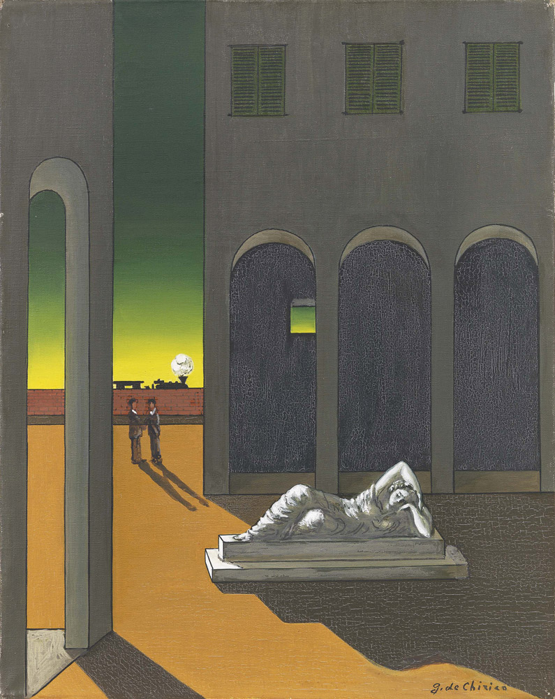 Giorgio de Chirico, Volos 1888 - Roma 1978, Piazza d'Italia, 1966, Olio su tela, cm. 50x40, Firma in basso a destra: G. de Chirico. Al verso sulla tela: dichiarazione di autenticità di Claudio Bruni, Roma 12-4-72., Storia: Collezione privata, Brescia; Galleria La Nuova Loggia, Bologna; Collezione privata, Bologna; Collezione privata, Bibliografia: Claudio Bruni Sakraischik, Catalogo Generale Giorgio de Chirico, volume primo, opere dal 1951 al 1970, Electa Editrice, Milano, 1971, n. 123., Attestato di libera circolazione