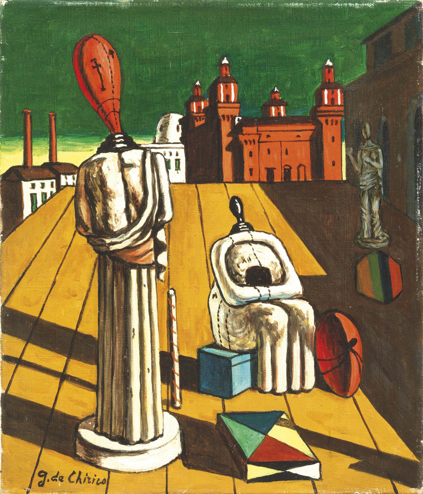 Giorgio de Chirico, Volos 1888 - Roma 1978, Le Muse inquietanti, 1960-62, Olio su tela, cm. 35x30, Firma in basso a sinistra: G. de Chirico; titolo e firma al verso sulla tela: "Le Muse inquietanti" / Giorgio de Chirico: dichiarazione di autenticità del notaio Diego Gandolfo, Roma, 8 marzo 1963: timbro Galleria d'Arte Sianesi, Milano; sul telaio: timbro Collezione Palatiello, con n. 211., Storia: Collezione privata, Genova; Galleria d'Arte Sianesi, Milano; Galleria Spagnoli, Firenze; Collezione privata, Certificato su foto di Claudio Bruni Sakraischik, Roma, 17 dicembre 1980, perizia n. 161/80, con rettifica delle dimensioni (a cm. 35x30) da parte della Fondazione Giorgio e Isa de Chirico, Roma, 12 febbraio 2007, Prot. n. 027/07., Bibliografia: Claudio Bruni Sakraischik, Catalogo Generale Giorgio de Chirico, volume ottavo, opere dal 1951 al 1974, Electa Editrice, Milano, 1987, n. 1231 (con dimensioni cm. 50x40)., Attestato di libera circolazione