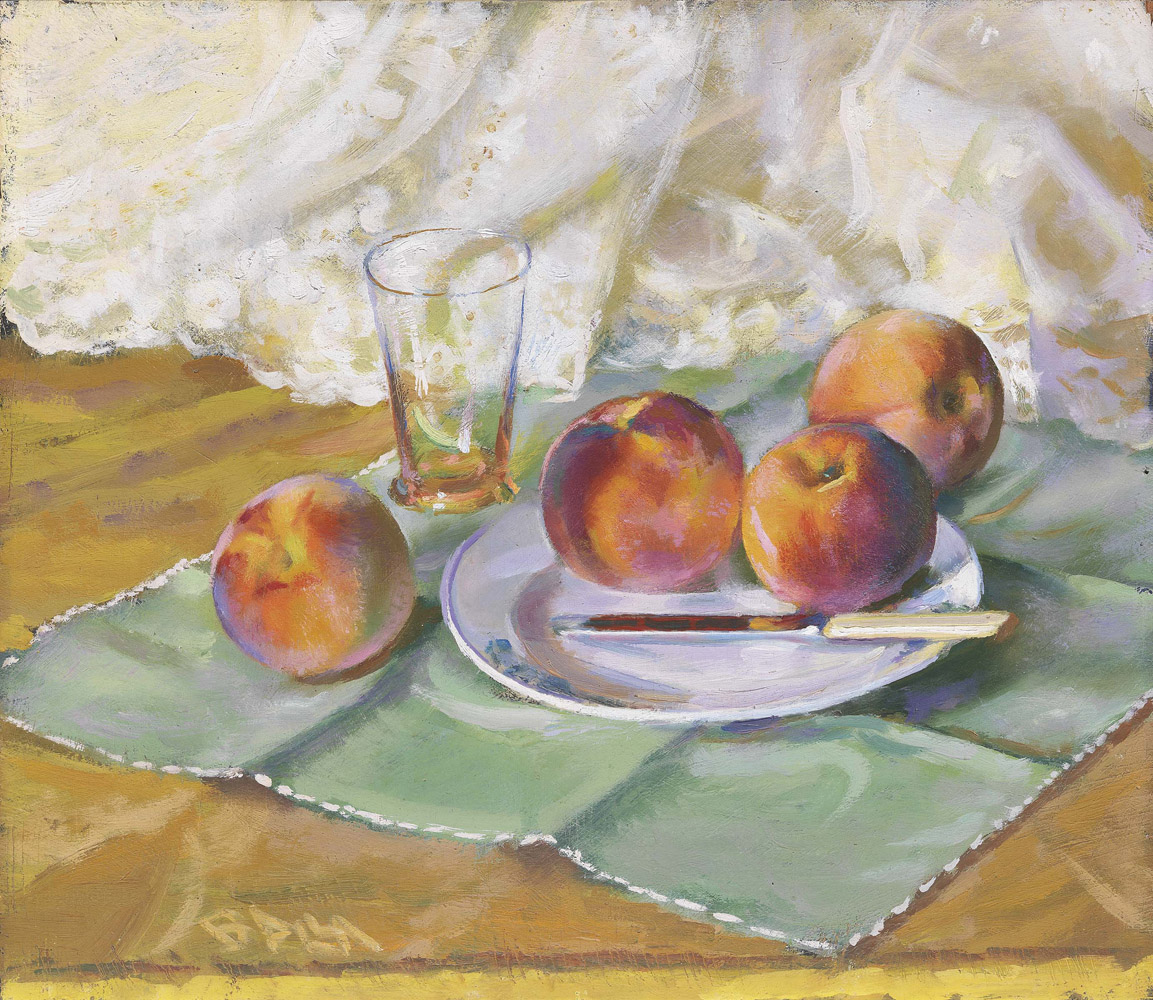 Giacomo Balla, Torino 1871 - Roma 1958, Pesche romane, 1950 ca., Olio su tavola, cm. 44x51,5, Firma in basso a sinistra: Balla; titolo e scritta al verso: Pesche / Romane / di Balla / [via] Oslavia 39 B / Roma: etichetta Ente Provinciale Turismo. Torino. Associazione Commercianti / L'Arte in Vetrina, con timbro II Mostra Nazionale L'Arte in Vetrina, Torino., Storia: Giacomo Balla, Roma (1952); Collezione privata, Roma; Collezione privata, Prato; Collezione privata, Certificato su foto di Elena Gigli, Roma, 14 aprile 2017, archivio Gigli serie 2017, n. 732