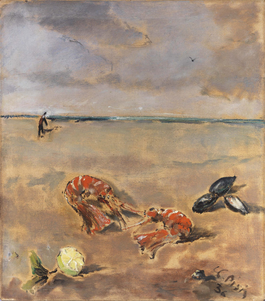 Filippo de Pisis, Ferrara 1896 - Milano 1956, Natura morta marina, 1936, Olio su tela, cm. 80,6x70,5, Firma e data in basso a destra: de Pisis / 36; scritta al verso sulla tela: Che rosso sfacciato!!!.. Pippo; sul telaio: etichetta Galleria del Girasole, Udine, con n. FD.P I., Certificato su foto Associazione per il Patrocinio dell'Opera di Filippo de Pisis, Milano, 16 ottobre 1996, con n. 00658., Esposizioni: Filippo de Pisis. Artista d'Europa, Cortina d'Ampezzo, Galleria d'Arte Frediano Farsetti, 27 dicembre 2001 - 6 gennaio 2002, poi Milano, Farsettiarte, 6 febbraio - 7 marzo 2002, cat. n. 16, illustrato a colori