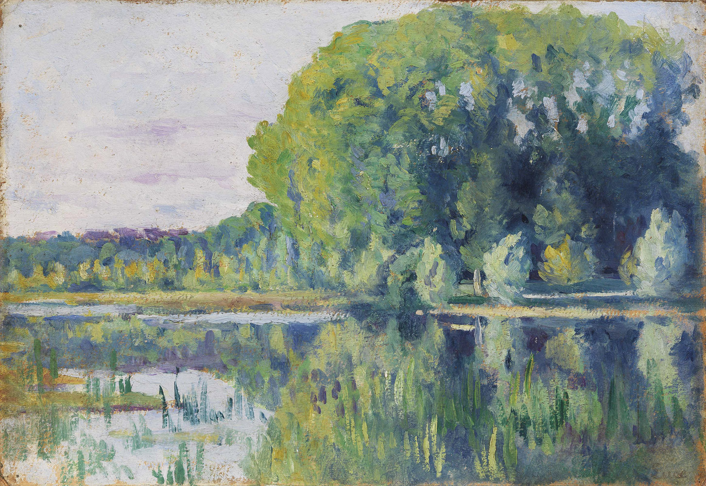 Maximilien Luce, Parigi 1858 - 1941, Moulineaux, l'Etang, (1900-05 ca.), Olio su cartone, cm. 25,5x36,7, Firma in basso a destra: Luce., Storia: Hammer Galleries, New York; Collezione privata, Bibliografia: Jean Bouin-Luce, Denise Bazetoux, Maximilien Luce. Catalogue raisonné de l'oeuvre peint, JBL, Parigi, 1986, vol. II, p. 31, n. 1270., Attestato di libera circolazione