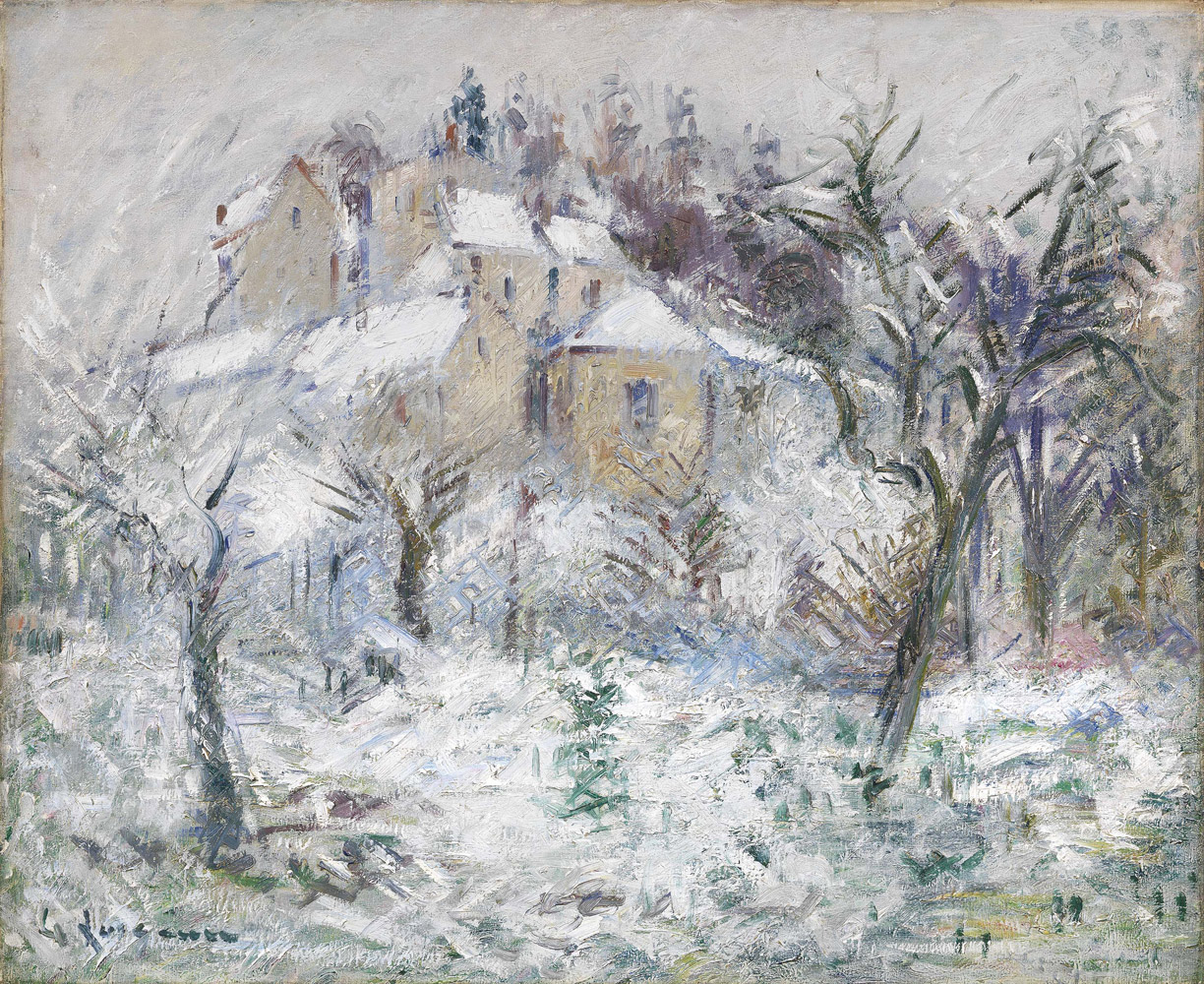 Gustave Loiseau, Parigi 1865 - 1935, Maisons à Pontoise sous la neige, 1930, Olio su tela, cm. 60,6x73,8, Firma in basso a sinistra: G. Loiseau; data e luogo al verso sul telaio: mars 1930 Pontoise., Storia: Collezione privata, New York; Collezione privata, Certificato su foto di Didier Imbert, Parigi, 2 novembre 2007, con n. A 1607 e indicazione di prossima pubblicazione nel Catalogo Ragionato dell'artista., Attestato di libera circolazione