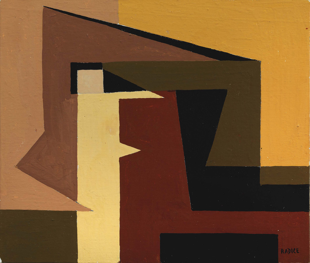 Mario Radice, Como 1900 - 1987, Composizione gru, 1950-51, Olio su tela, cm. 30x35, Firma in basso a destra. Radice. Al verso sul telaio: timbro Galleria d'A [...] Francesco Hayez., Certificato su foto di Luciano Caramel, Como, 6 maggio 2005