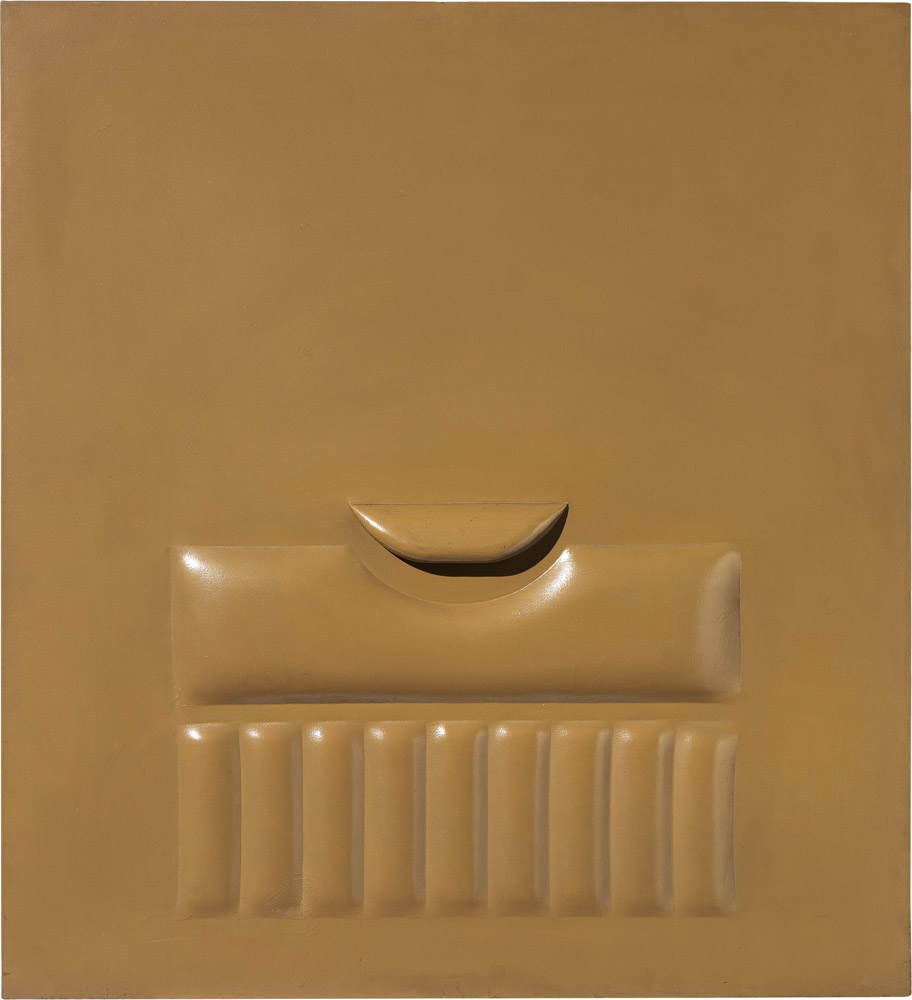 Agostino Bonalumi, Vimercate (Mi) 1935 - Milano 2013, Ocra, 1965, Tela estroflessa e tempera vinilica, cm. 110x100, Al verso sulla tela: Agostino / Bonalumi., Foto autenticata dall'artista in data 1991, con etichetta e timbro Archivio Bonalumi, Milano, con n. 65-059., Attestato di libera circolazione