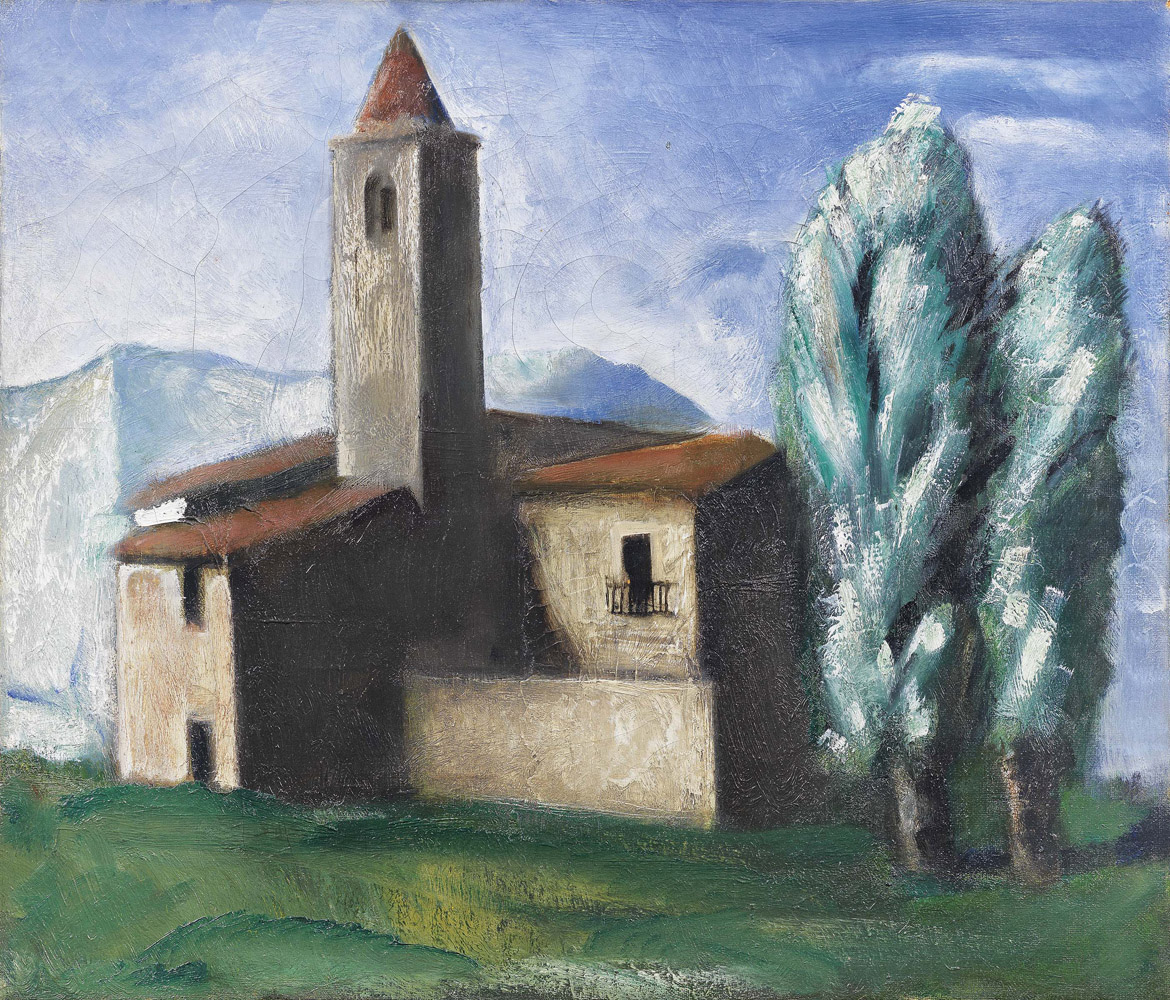 Mario Sironi, Sassari 1885 - Milano 1961, Chiesa e alberi di pioppo, 1928-29, Olio su tela, cm. 60x70, Al verso sul telaio: timbro Galleria d'Arte Sant'Ambrogio, Milano., Storia: Collezione privata, Milano; Collezione privata, Venezia; Collezione privata, Esposizioni: Sette artisti moderni, Milano, Galleria Milano, aprile 1929, cat. tav. 17, illustrato;, Sironi 1885 - 1961, Milano, Palazzo Reale, 4 ottobre - 8 dicembre 1985, cat. pp. 82, 213, n. 66, illustrato (con data 1926);, Mario Sironi 1885 - 1961, Roma, Galleria Nazionale d'Arte Moderna, 9 dicembre 1993 - 27 febbraio 1994, cat. pp. 198, 199, illustrato a colori., Bibliografia: Margherita Sarfatti, Almanacco Enciclopedico del "Popolo d'Italia", anno 9, Tipografia del Popolo d'Italia, Milano, 1930, p. 530;, Fortunato Bellonzi, Sironi, apparati biografici e bibliografici di Claudia Gian Ferrari, Electa Editrice, Milano, 1985, p. 83, n. 73;, Mario Sironi 1885-1961, catalogo della mostra, a cura di Elena Pontiggia, Roma, Complesso del Vittoriano, 4 ottobre 2014 - 8 febbraio 2015, Skira Editore, Milano, 2014, p. 58, n. 45