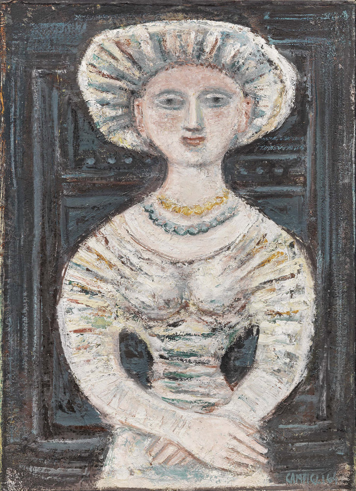 Massimo Campigli, Berlino 1895 - St.Tropez 1971, Figura su fondo scuro, 1964, Olio su tela, cm. 65,5x47, Firma e data in basso a destra: Campigli 64. Al verso sulla tela: scritta Proprietà / Rinaldo Rotta / Genova / Collezione personale: tre timbri Galleria d'Arte R. Rotta, Genova; sul telaio: etichetta Comune di Ferrara - Palazzo dei Diamanti / Direzione Gallerie Civiche d'Arte Moderna / Opera esposta nella rassegna / Campigli - 1979: timbro Galleria d'Arte R. Rotta, Genova., Storia: Collezione R. Rotta, Genova; Collezione privata, Foto autenticata dall'artista, St. Tropez 10/8/64., Esposizioni: Massimo Campigli, Ferrara, Galleria Civica d'Arte Moderna, Palazzo dei Diamanti, 30 giugno - 7 ottobre 1979, cat. n. 79, illustrato., Bibliografia: Nicola Campigli, Eva Weiss, Marcus Weiss, Campigli, catalogue raisonné, vol. II, Silvana Editoriale, Milano, 2013, p. 802, n. 64-035