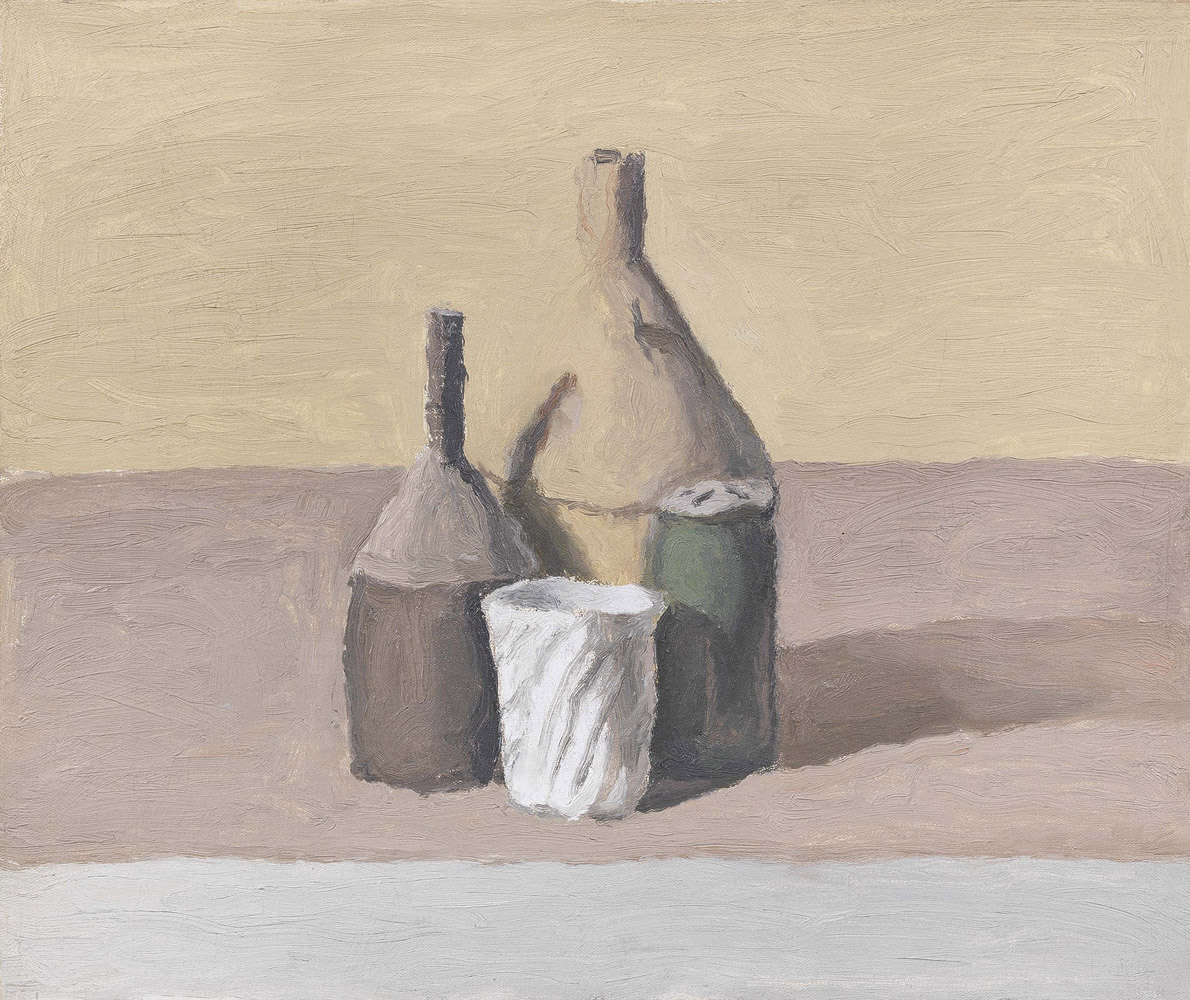 Giorgio Morandi, Bologna 1890 - 1964, Natura morta, 1956, Olio su tela, cm. 30,7x36, Firma al verso sulla tela: Morandi. Sul telaio: etichetta Peggy Guggenheim Collection / The Salomon R. Guggenheim Foundation / 30.4/13.9.98 / Exhibition Morandi ultimo nature morte / 1950-1964, con n. 29: timbro Galleria del Milione, Milano, con n. 7239: etichetta Galleria del Milione, Milano, con n. 7239: etichetta Galleria dello Scudo, Verona: etichetta Morandi / ultimo / nature morte / 1950-1964 / Galleria dello Scudo - Verona / 14 dicembre 1997 - 28 febbraio 1998 / Opera esposta: etichetta Collezione / Riccardo e Magda Jucker / Milano., Storia: Galleria del Milione, Milano; Collezione Riccardo e Magda Jucker, Milano; Collezione privata, Esposizioni: Morandi ultimo, nature morte 1950 - 1964, a cura di Laura Mattioli Rossi, Verona, Galleria dello Scudo, 14 dicembre 1997 - 28 febbraio 1998, cat. pp. 162, 165, n. 29, illustrato a colori., Bibliografia: Lamberto Vitali, Morandi. Catalogo generale, volume secondo, 1948-1964, seconda edizione, Electa Editrice, Milano, 1983, n. 1004., Attestato di libera circolazione