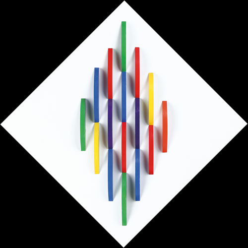 LORENZO PIEMONTI Carate Brianza (Mi) 26/04/1935 Cromoplastico Madì, 2002 acrilici su corian romboidale diagonale cm.70, titolo, firma, anno, etichetta e timbri dell'artista al retro, opera registrata al numero 691 come da dichiarazione su foto.