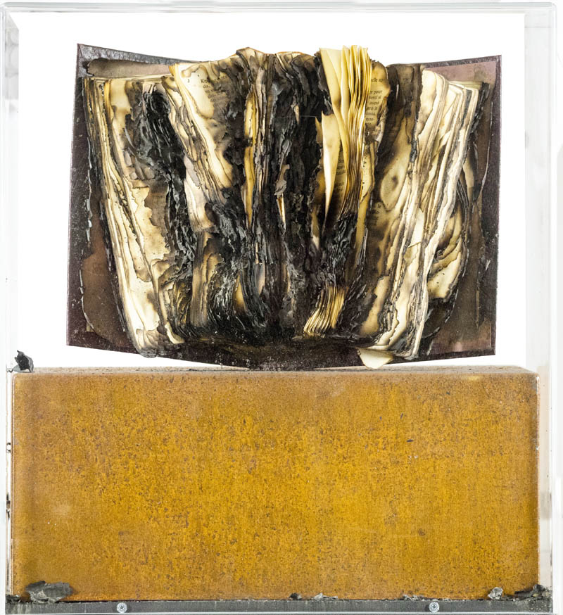 Bernard Aubertin ( Fotenay aux Roses 1934 2015 ) Livre Brulé 2012 Libro bruciato di cm. 41x26,5x36,5 in teca di plexiglas Sul verso: firma e data. Esposizione: "Bernard Aubertin - Opere Scelte, 26 Marzo al 20 Maggio 2016, Armanda Gori Arte, Pubblicato sul catalogo della mostra a pag. 31. Autentica dell'Archivio delle Opere di Bernard Aubertin su foto, con timbro a secco e Archivio n° LB21 - 1000111123, datato Maggio 2016 (Fronte e retro);