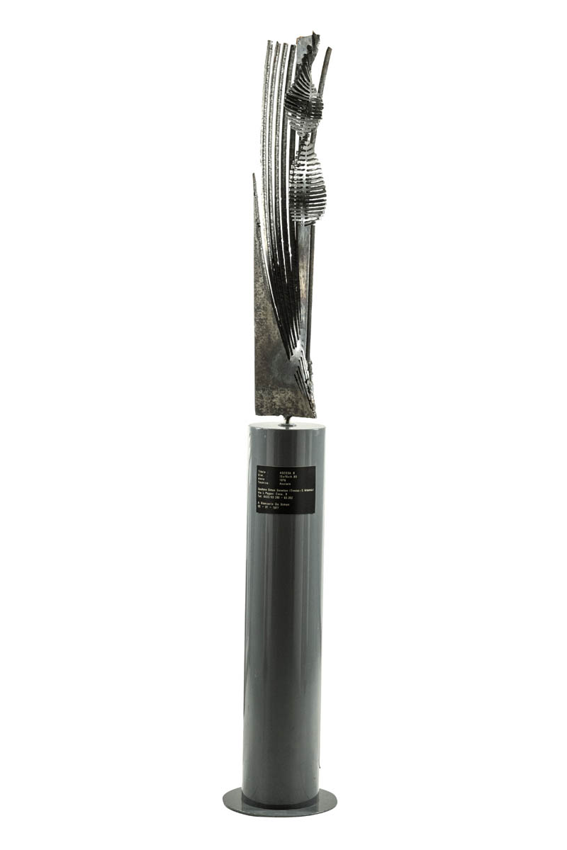 Simon Benetton ( Treviso 1933 ) Ascesa B 1976 Scultura in acciaio di cm 80 h x 15 x 15 su base fatta su misura per un'altezza complessiva di 170 cm. Sulla scultura firma e data in basso Sulla base targa incisa con dedica a persona.