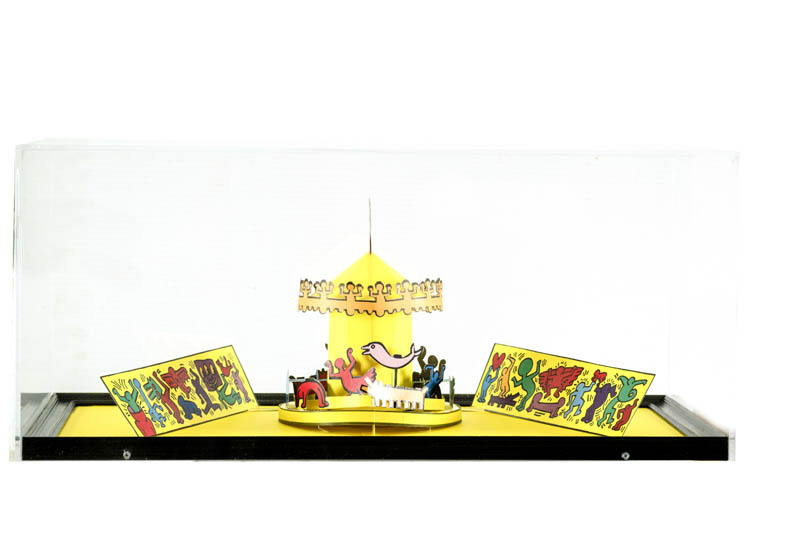 Keith Haring ( Pennsylvania 1958 New York 1990 ) Luna luna a poetic extravaganza 1986 Giostra di cartoncini stampati e d assemblati a mano su supporto di tavola in teca di plexiglas, cm. 29x66x36,Edizione limitata a 2000 esemplari. Editore: Luna Luna Freizeitanlangen Gmbh, stampatore Van Der Meer Paper Design Limited, Langley England.