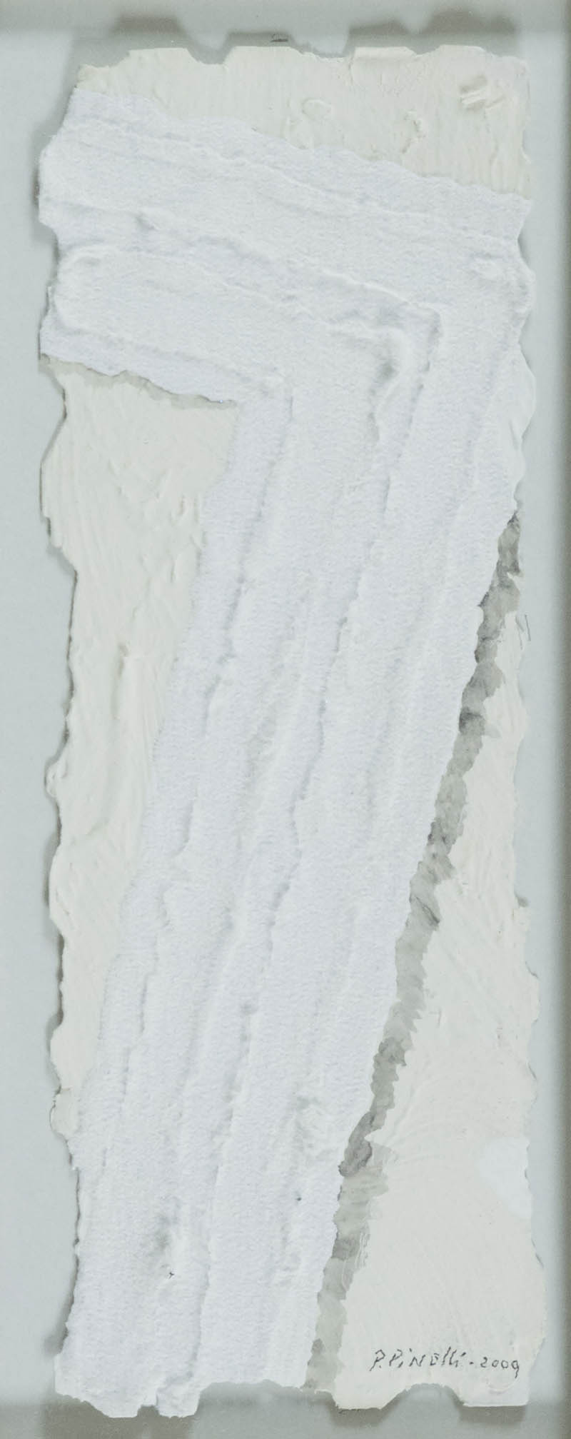 Pino Pinelli ( Catania 1938 ) Bianco - Girgio 2009 Pittura su carta irregolare, cm. 26,5x10 Firma e data in basso a destra. Sul verso: descrizione. Autentica dell'Artista su foto.
