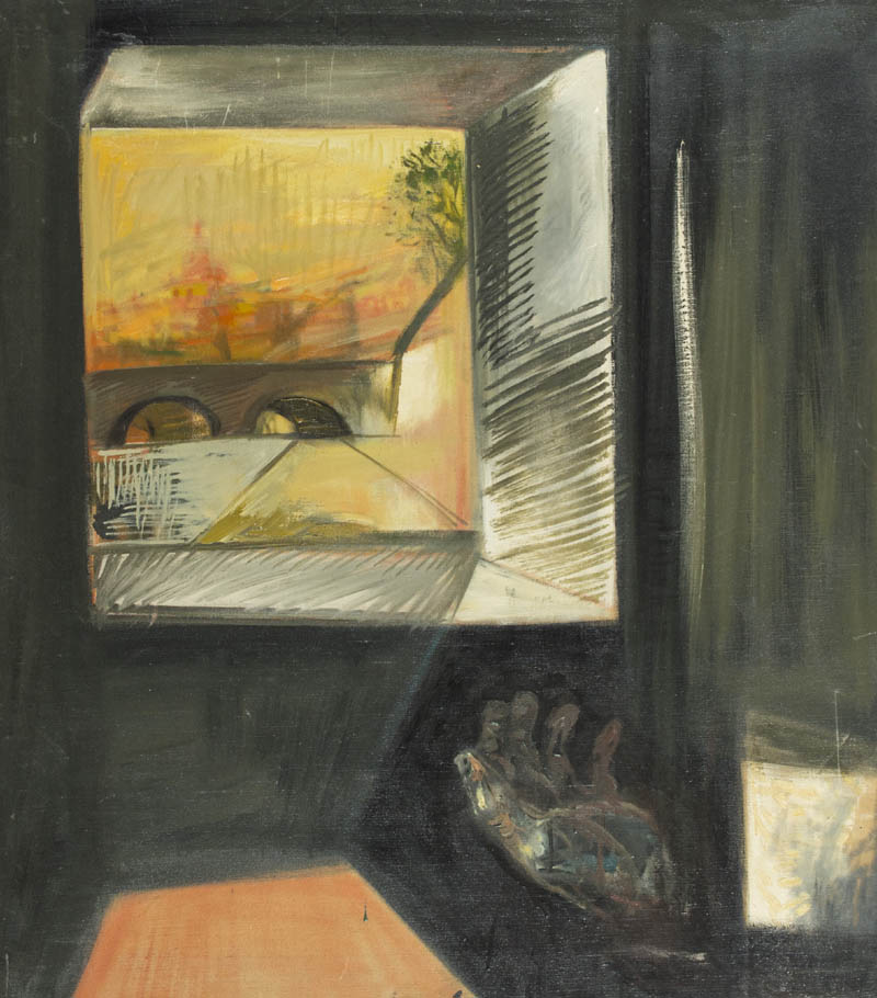 Ugo Attardi ( Sori (Ge) 1923 Roma 2006 ) Roma Olio su tela, cm. 80x70 Sul verso: Scritto "Attardi - Roma"; Timbro "Galleria Vinciana", Milano. Timbro : "Galleria d'Arte Nuova Milano", Milano.
