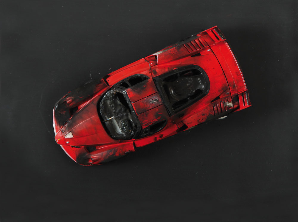 BERNARD AUBERTIN Fontenay aux Roses 1934 Senza titolo, 2010 modello di automobile in metallo bruciato e applicato su tavola cm. 30x40, firma e anno al retro, dichiarazione d'autenticità dell'artista su foto, fotografie allegate ritraenti l'artista mentre realizza e firma l'opera, entro teca in plexiglass.