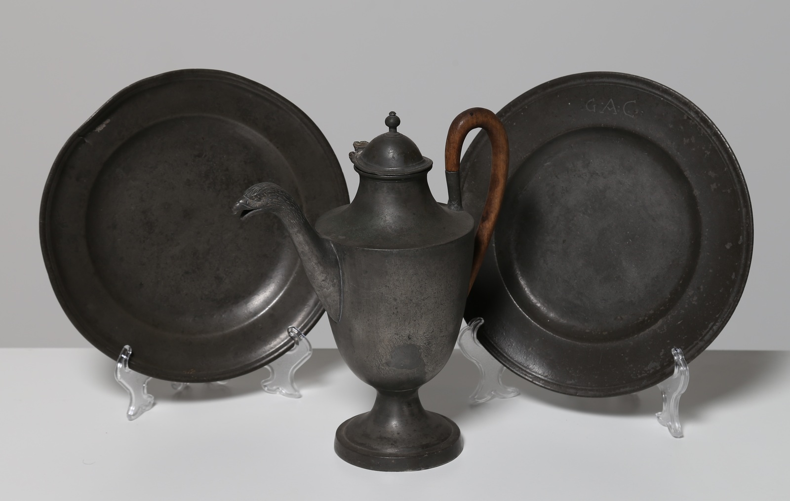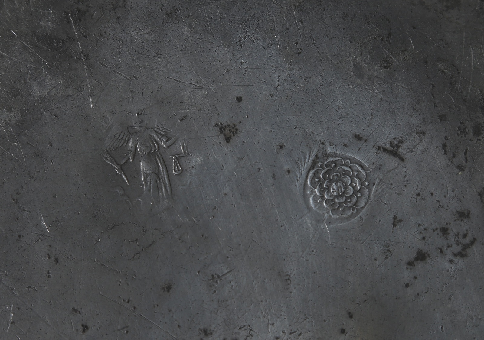 MANIFATTURA VENETA DEL XVII SECOLO Versatoio e due piatti in peltro, XVII...