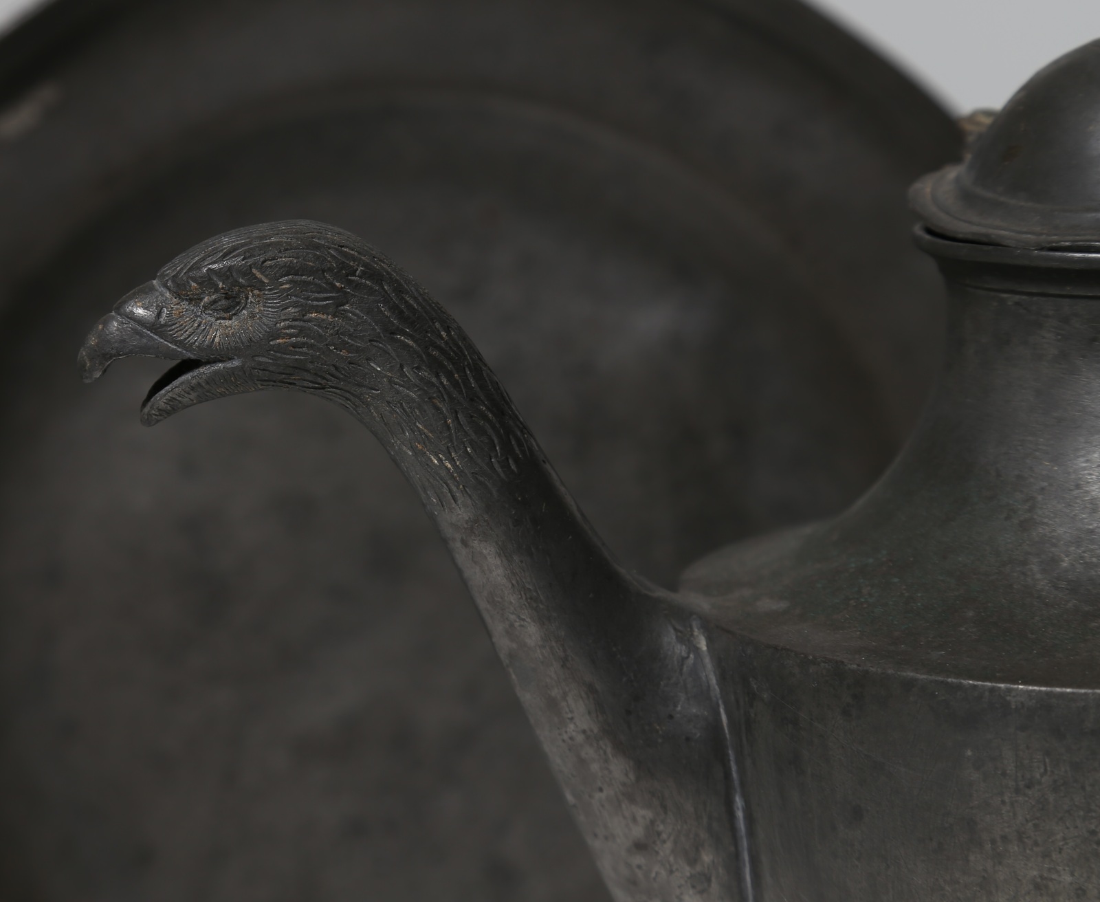 MANIFATTURA VENETA DEL XVII SECOLO Versatoio e due piatti in peltro, XVII secolo. . Cm 24,00 x 26,00 x 12,00. Misure: Versatoio 26 x 24 x 12 Piatto H 2 diametro 25,5 Piatto H 2 diametro 24,5