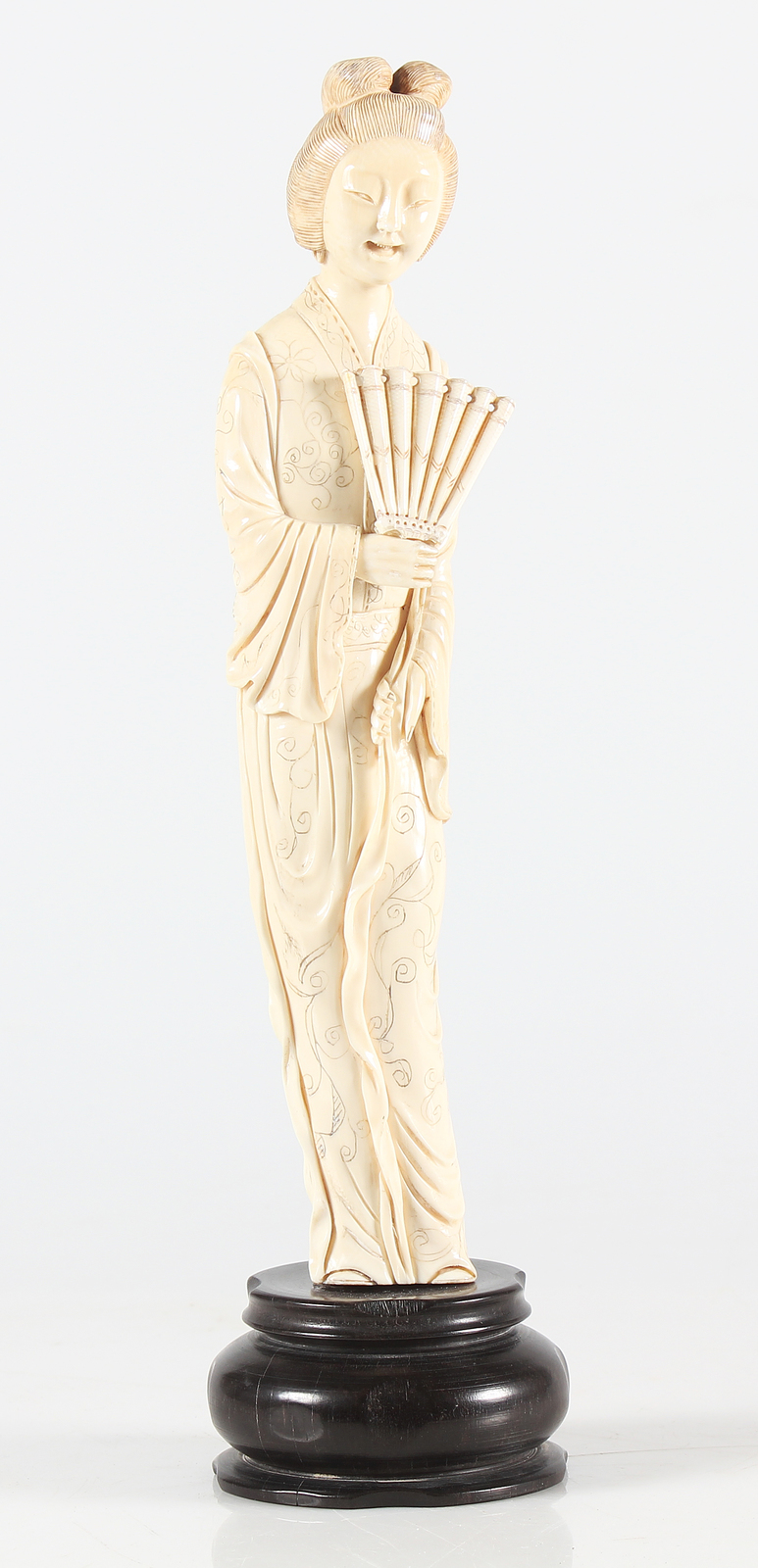 MANIFATTURA CINESE DEL XIX SECOLO Fanciulla con ventaglio. Avorio. Cm 26,00.
