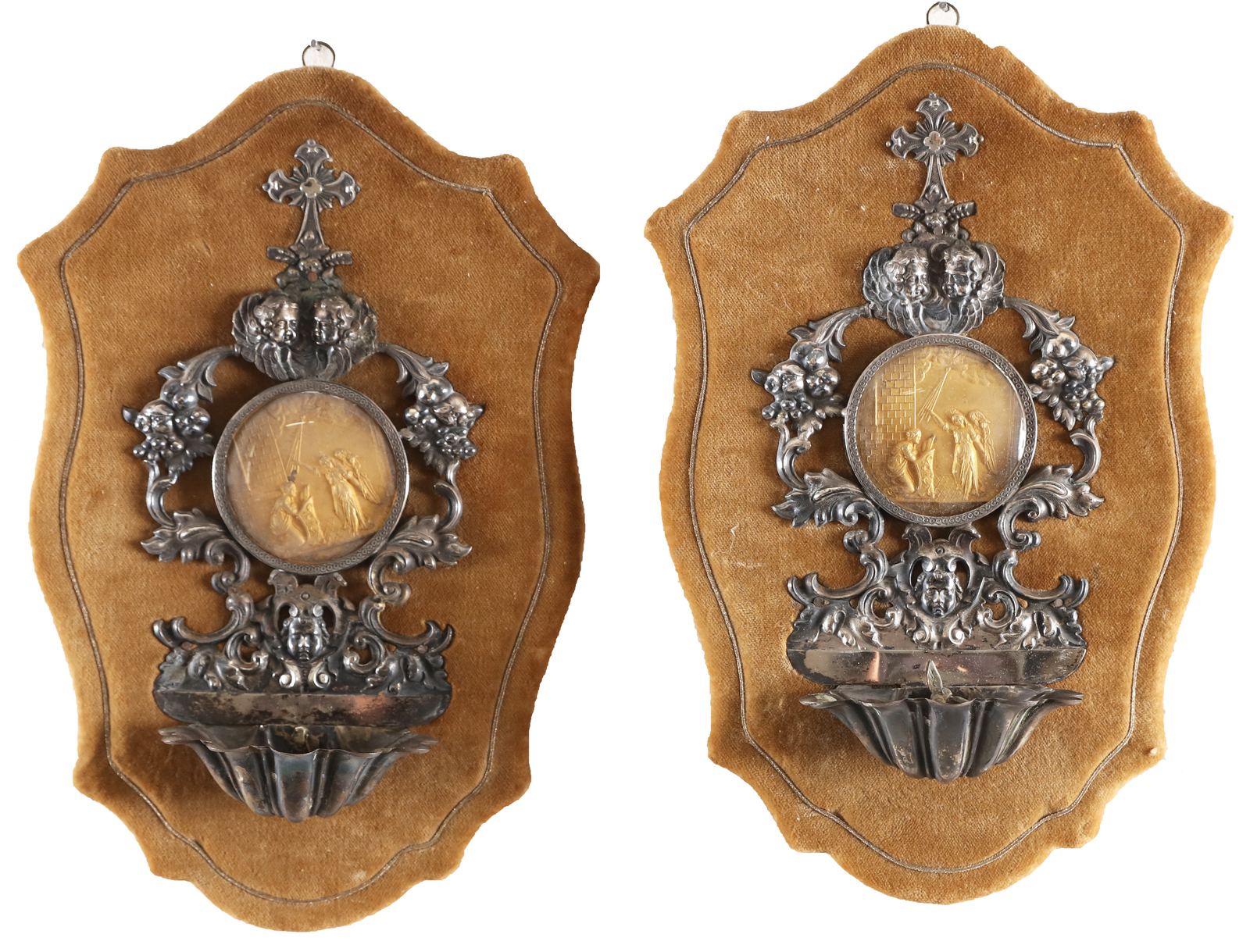 ARGENTIERE DEL XIX SECOLO Coppia di acquasantiere in argento sbalzato con...