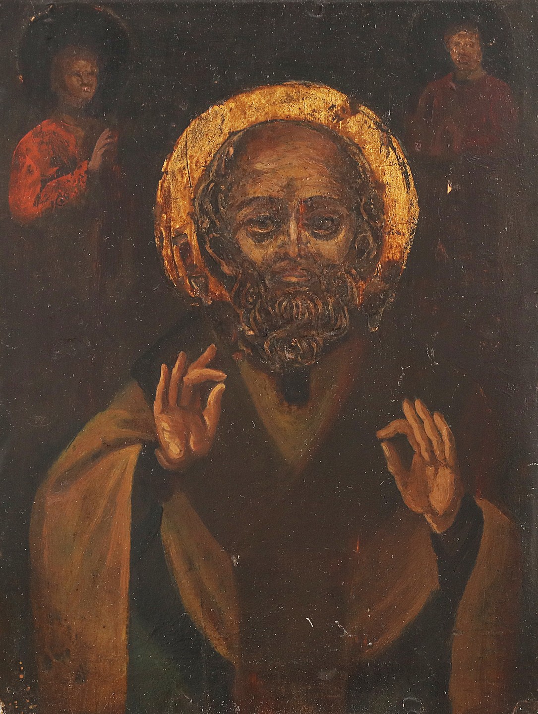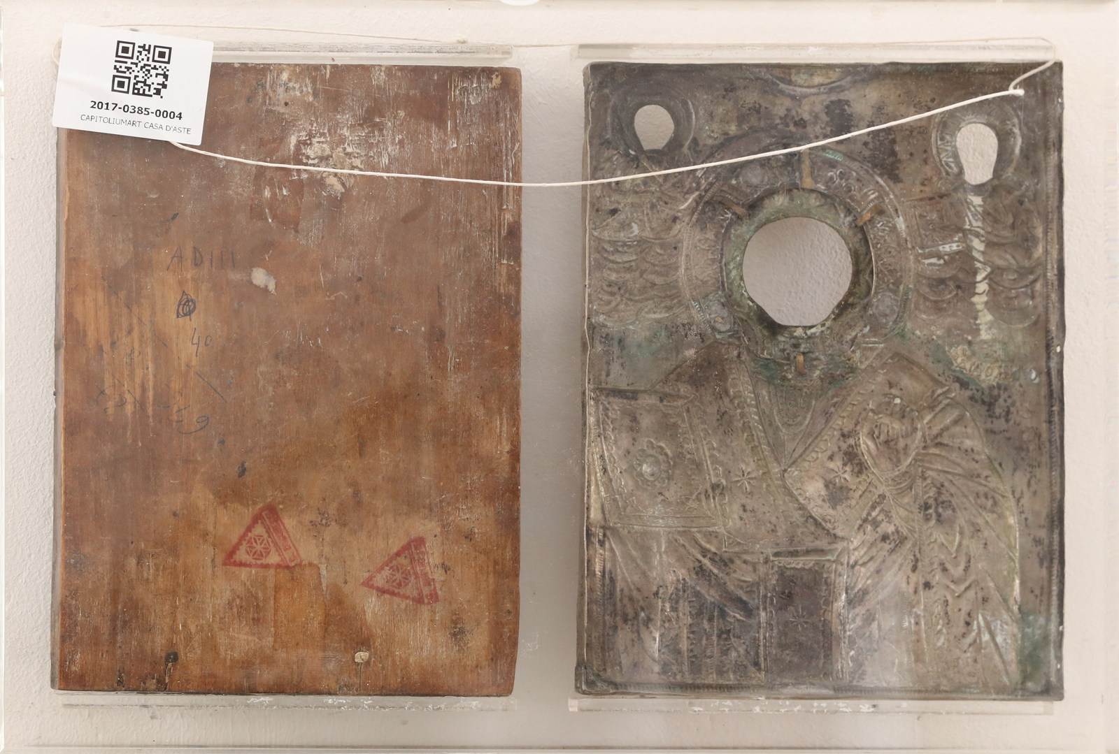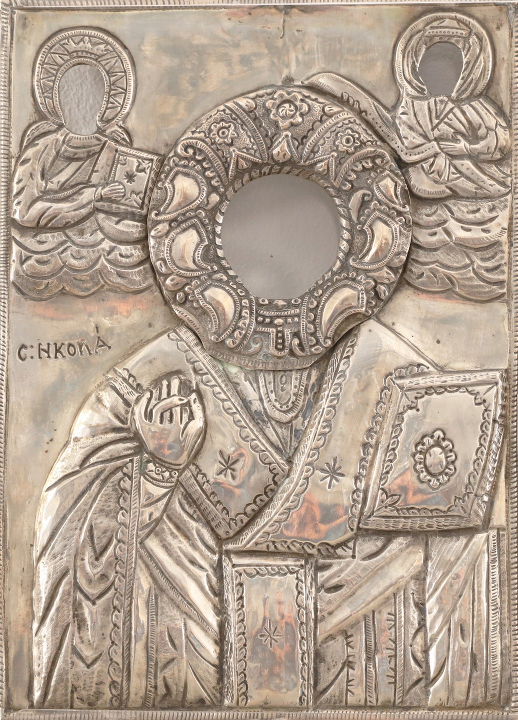 MANIFATTURA RUSSA DEL XIX SECOLO Icona con S. Nicola. Riza in argento. . Cm 16,00 x 23,00.
