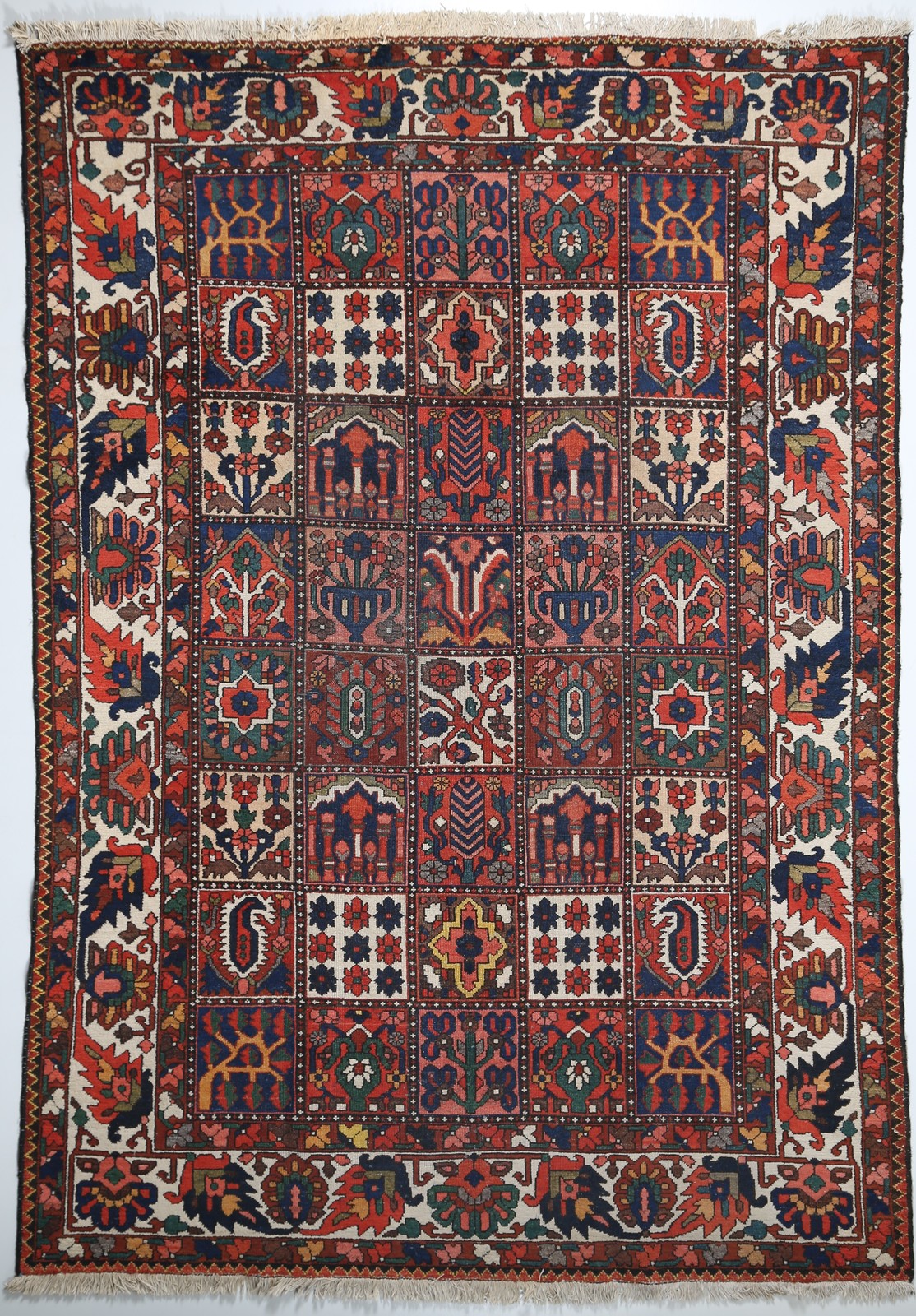 MANIFATTURA PERSIANA Tappeto persiano Baktiar con disegno a giardino composto da 7x5 formelle. . Cm 215,00 x 306,00. Dichiarazione di autenticità a cura di Cesare Franchi - Tappeti Orientali, Brescia.
