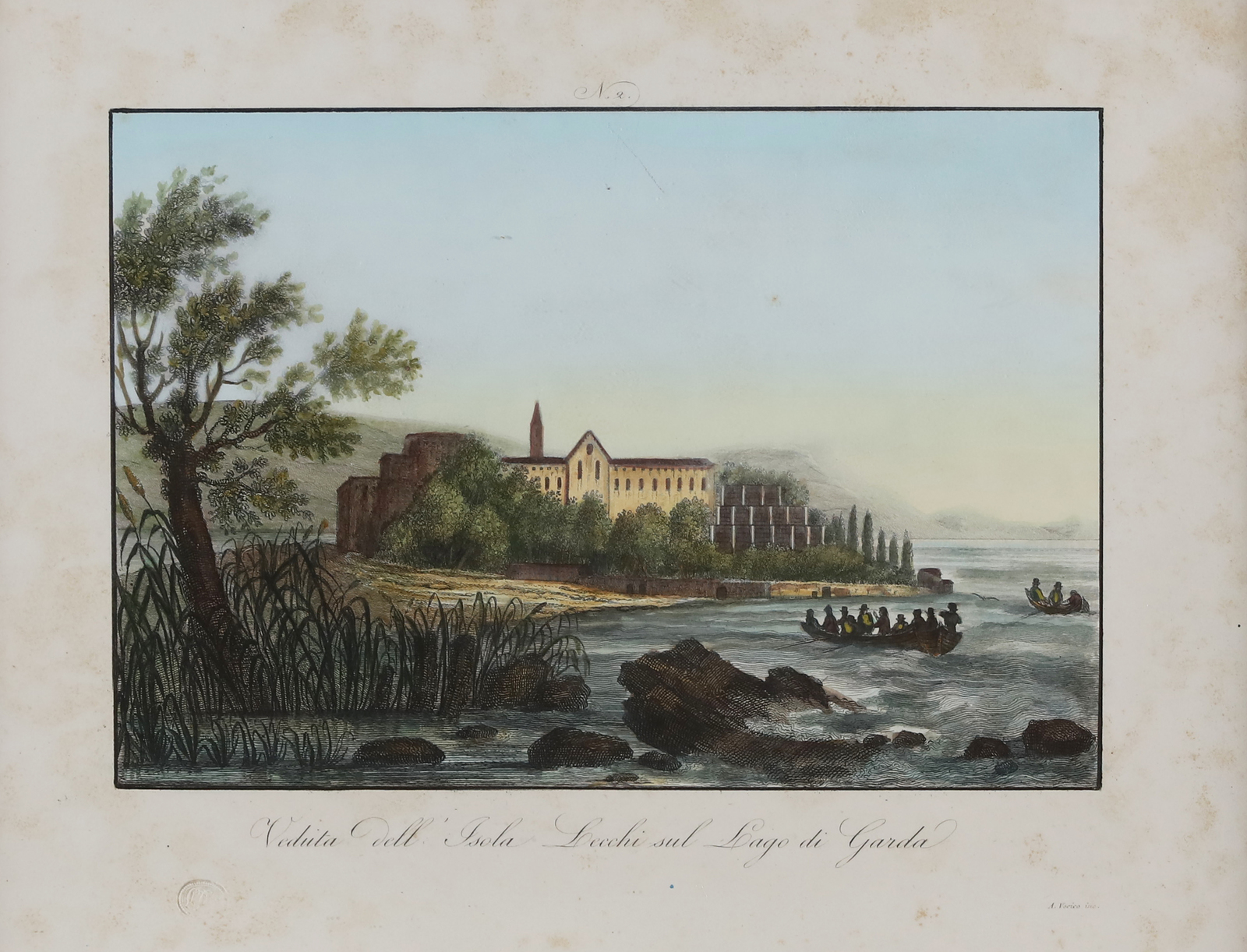 ORLANDINI ZUCCAGNI OTTAVIO (1784 - 1872) Veduta dell'isola Lechi sul Lago di Garda. Incisione. Cm 39,00 x 29,00. Edita a Firenze nel 1845, tratta dall'opera di Attilio Zuccagni Orlandini "Atlante Illustrato", come riportato sul retro. Cornice presente