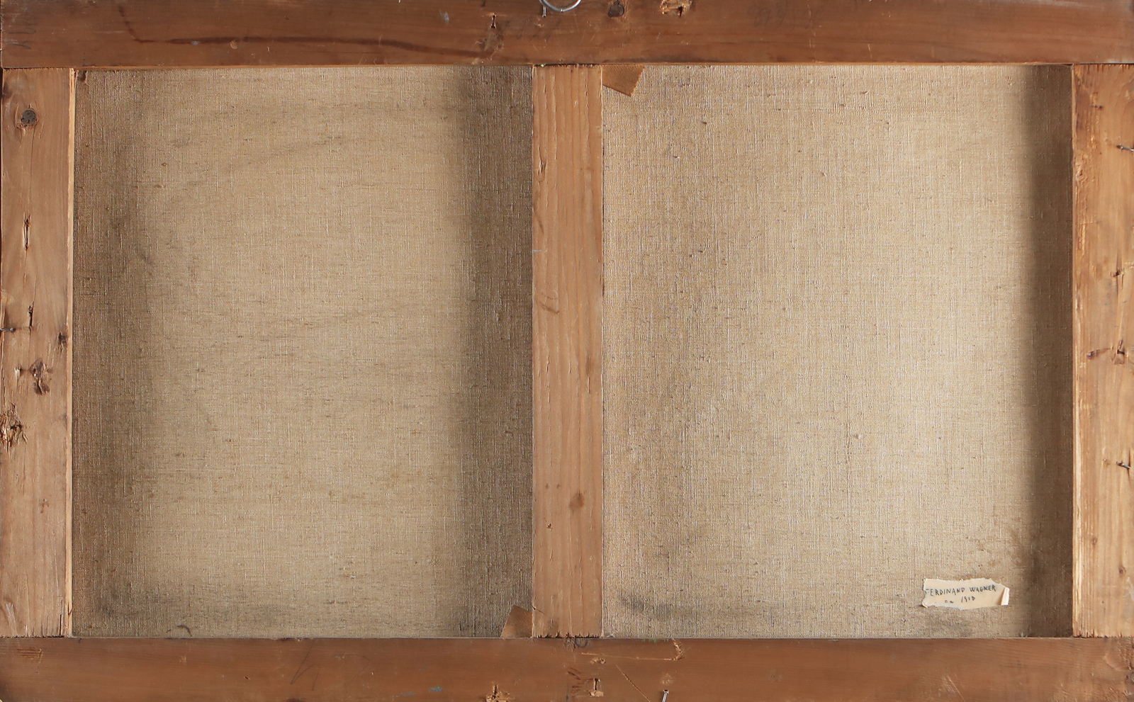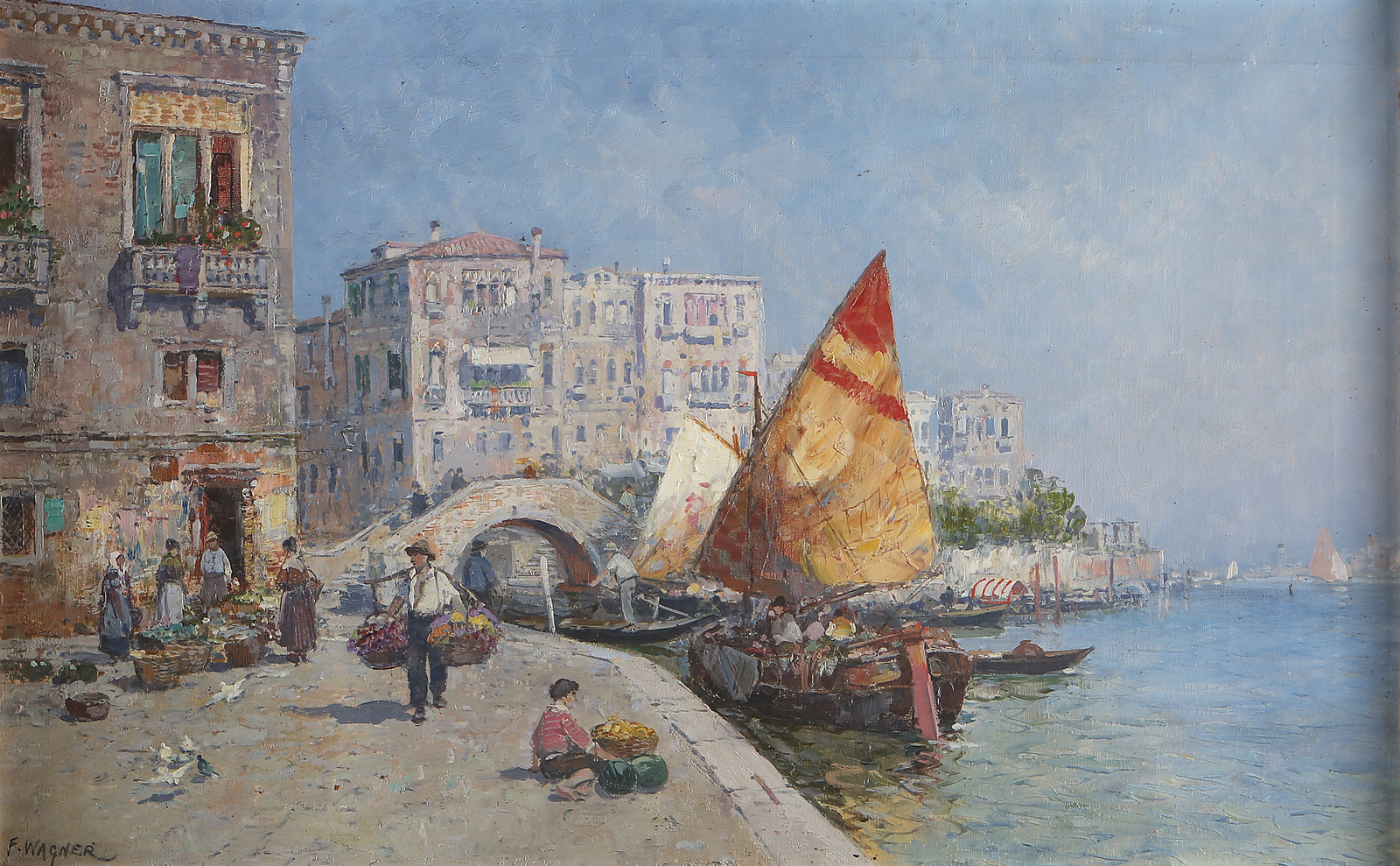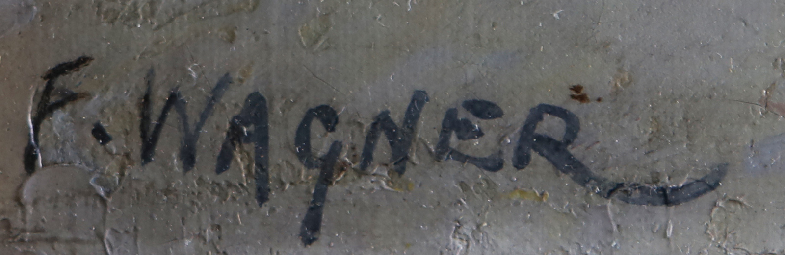 ARTISTA DEL XIX SECOLO Venezia con ponte e personaggi. Olio su tela . Cm 82,00 x 50,00. Firma in basso a sinistra F. Wagner. Cornice presente