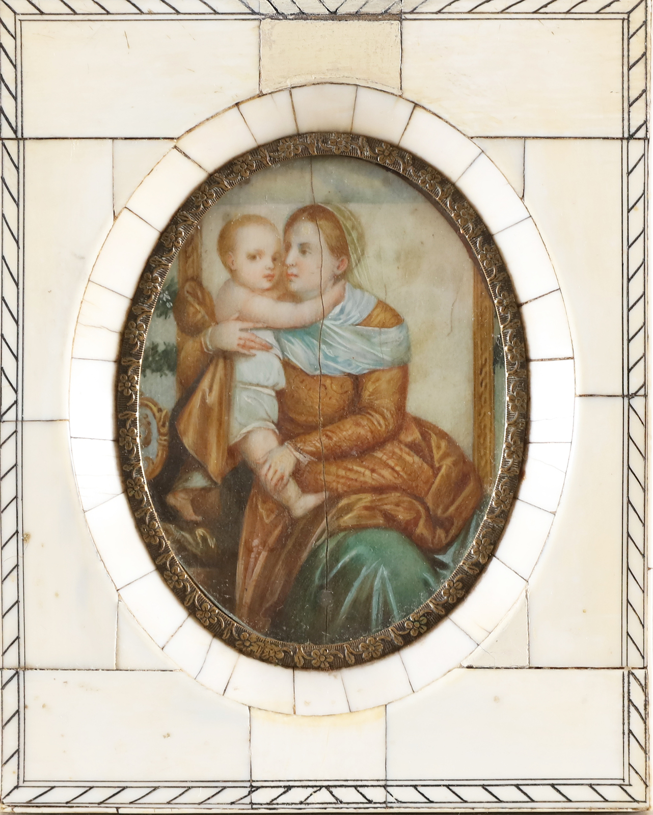 MINIATURISTA DEL XVIII SECOLO Madonna con Bambino. . Olio su avorio. . Cornice in osso.