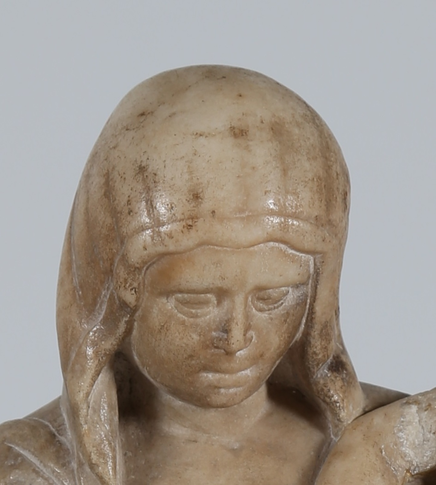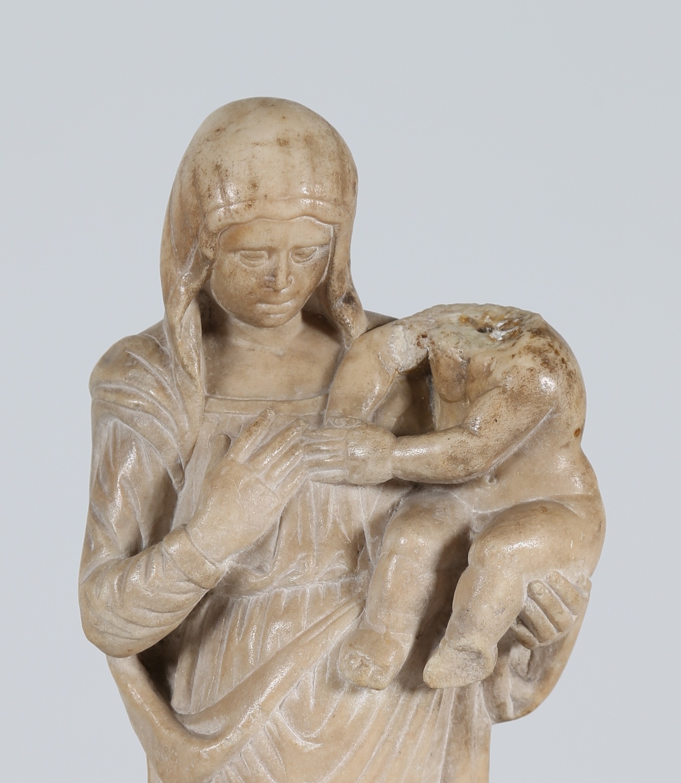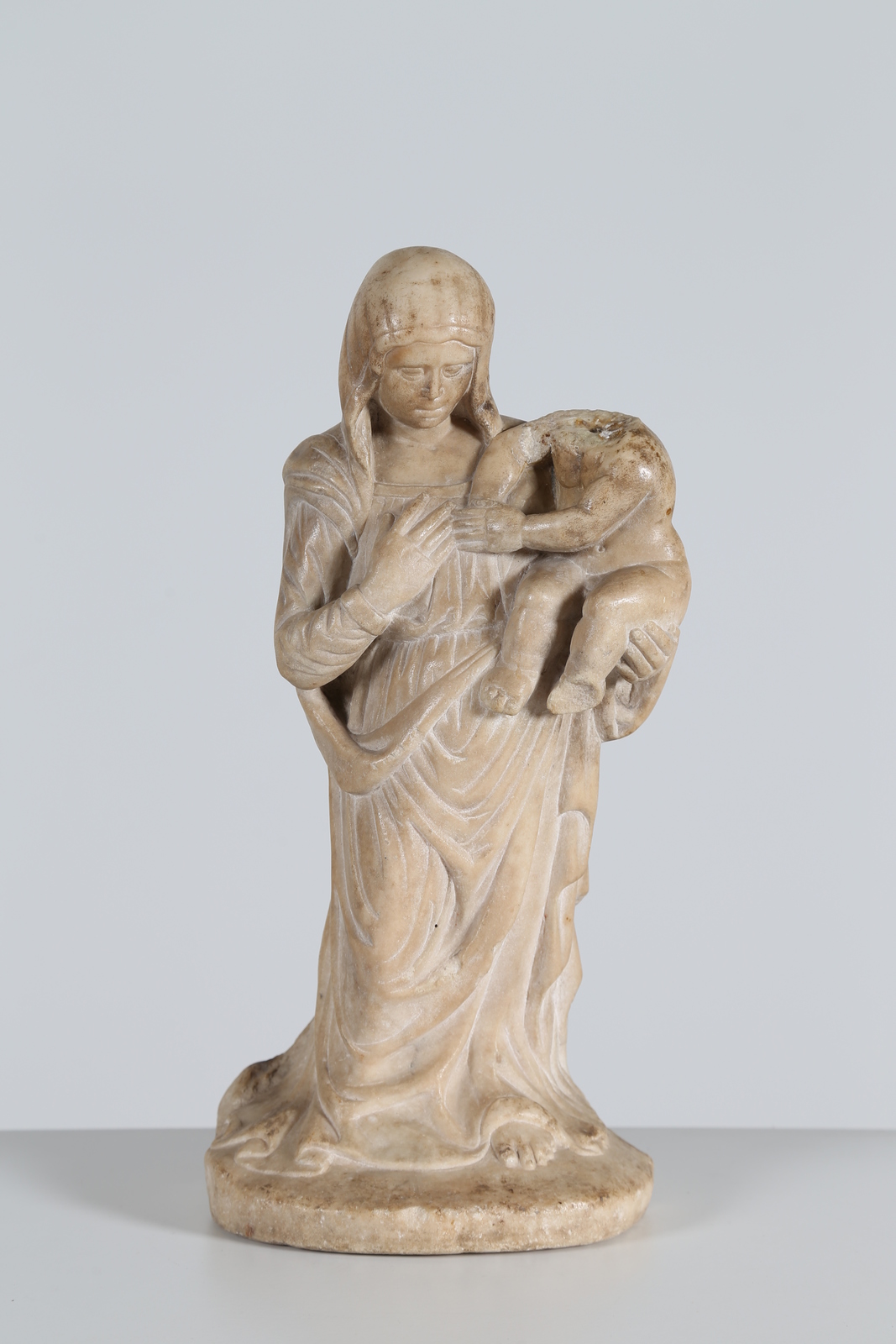 MANIFATTURA LOMBARDA DEL XVI SECOLO Madonna con Bambino. Marmo. Cm 18,50 x 39,00 x 16,00. Difetti e mancanze,