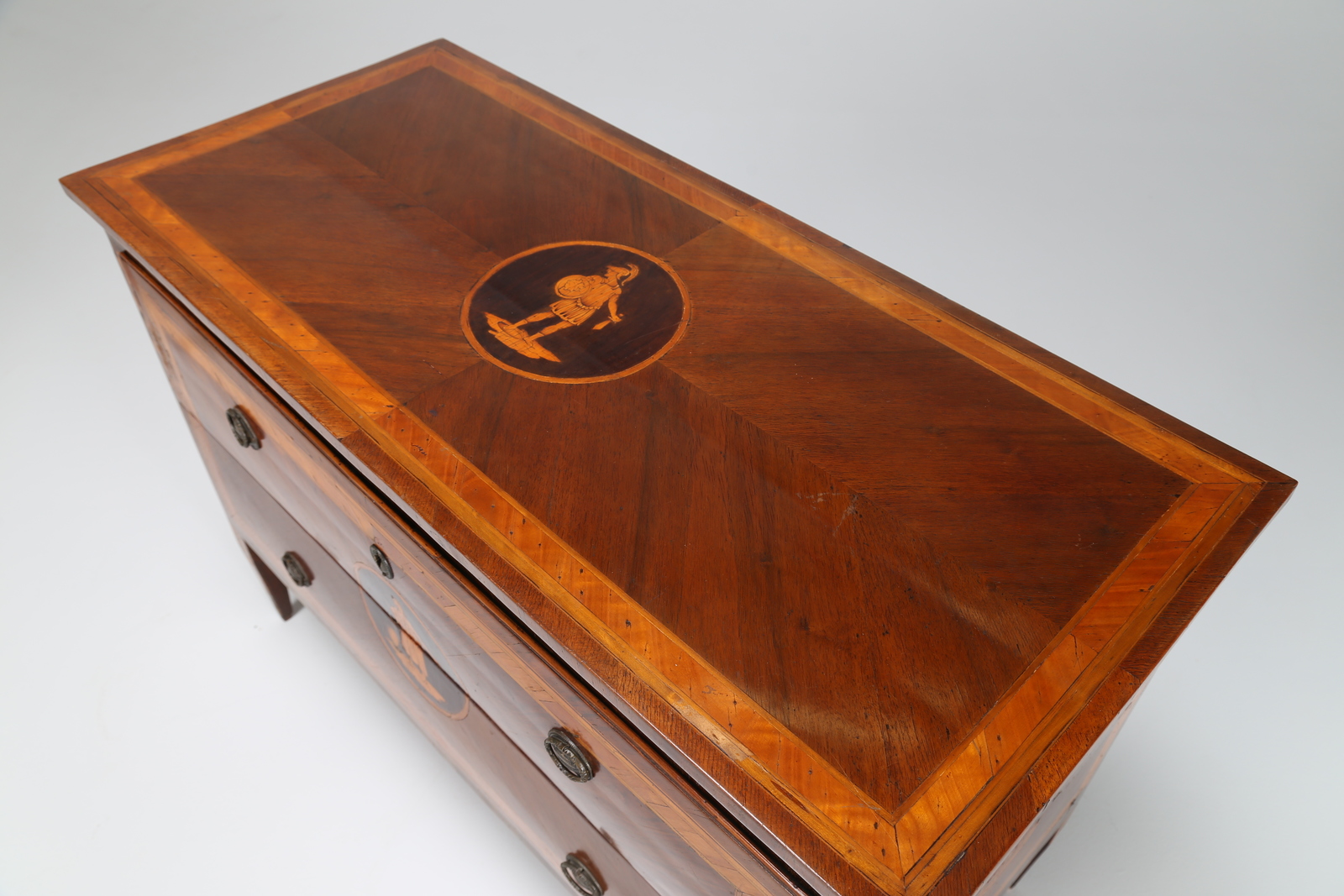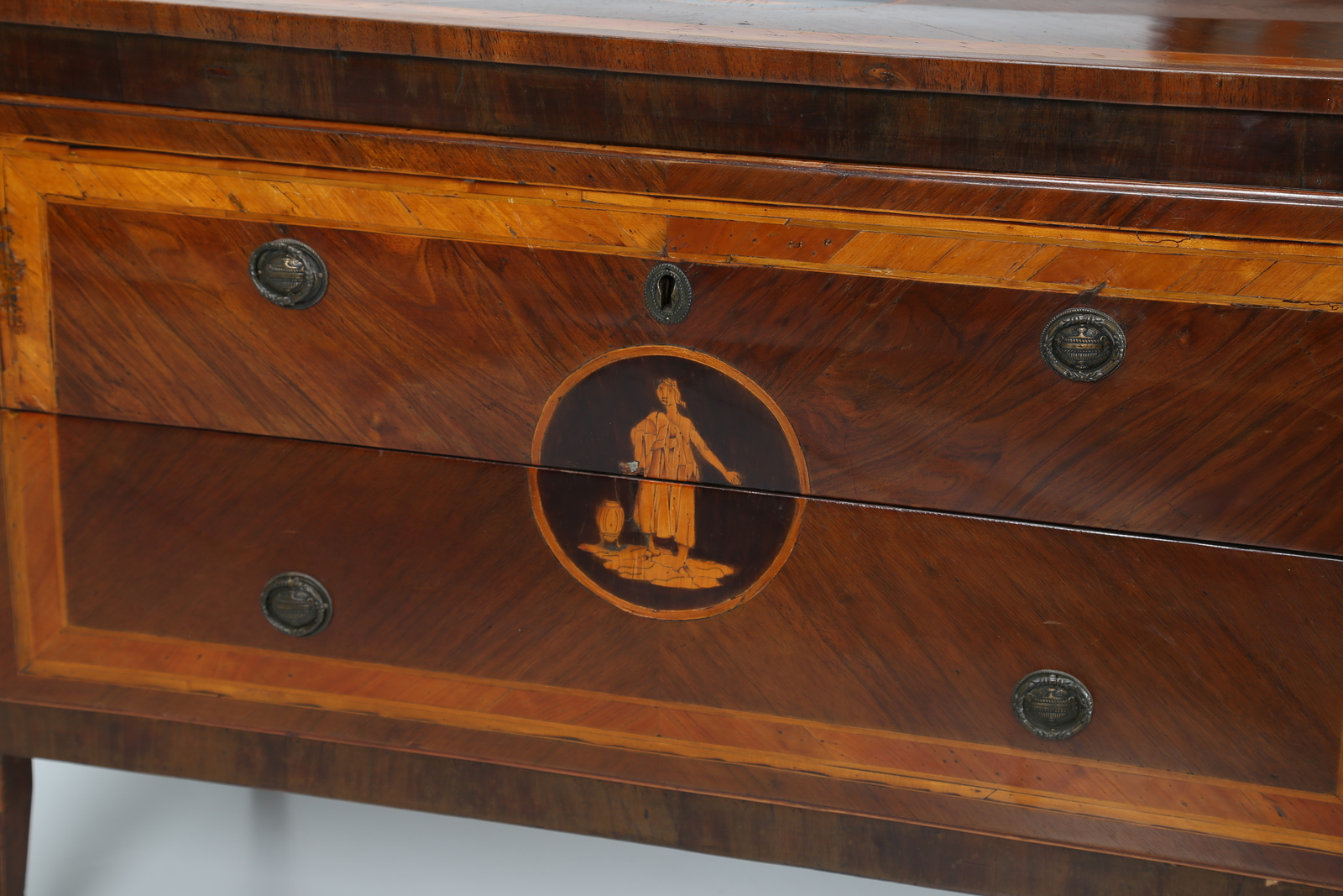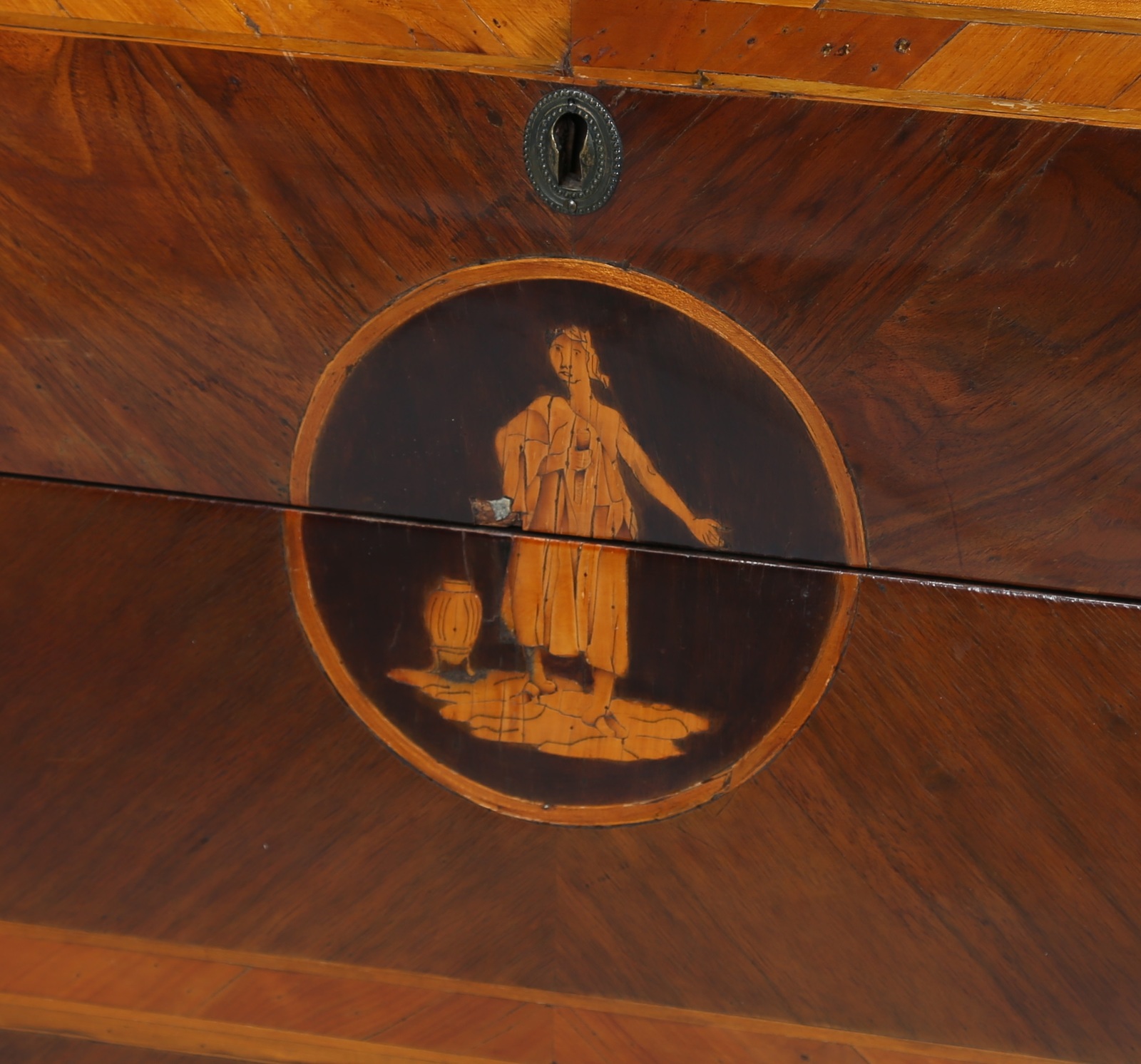 MANIFATTURA LOMBARDA DEL XVIII SECOLO Cassettone lastronato e intarsiato con figure classiche sul piano e sui fianchi. . Cm 116,00 x 81,00 x 52,00.