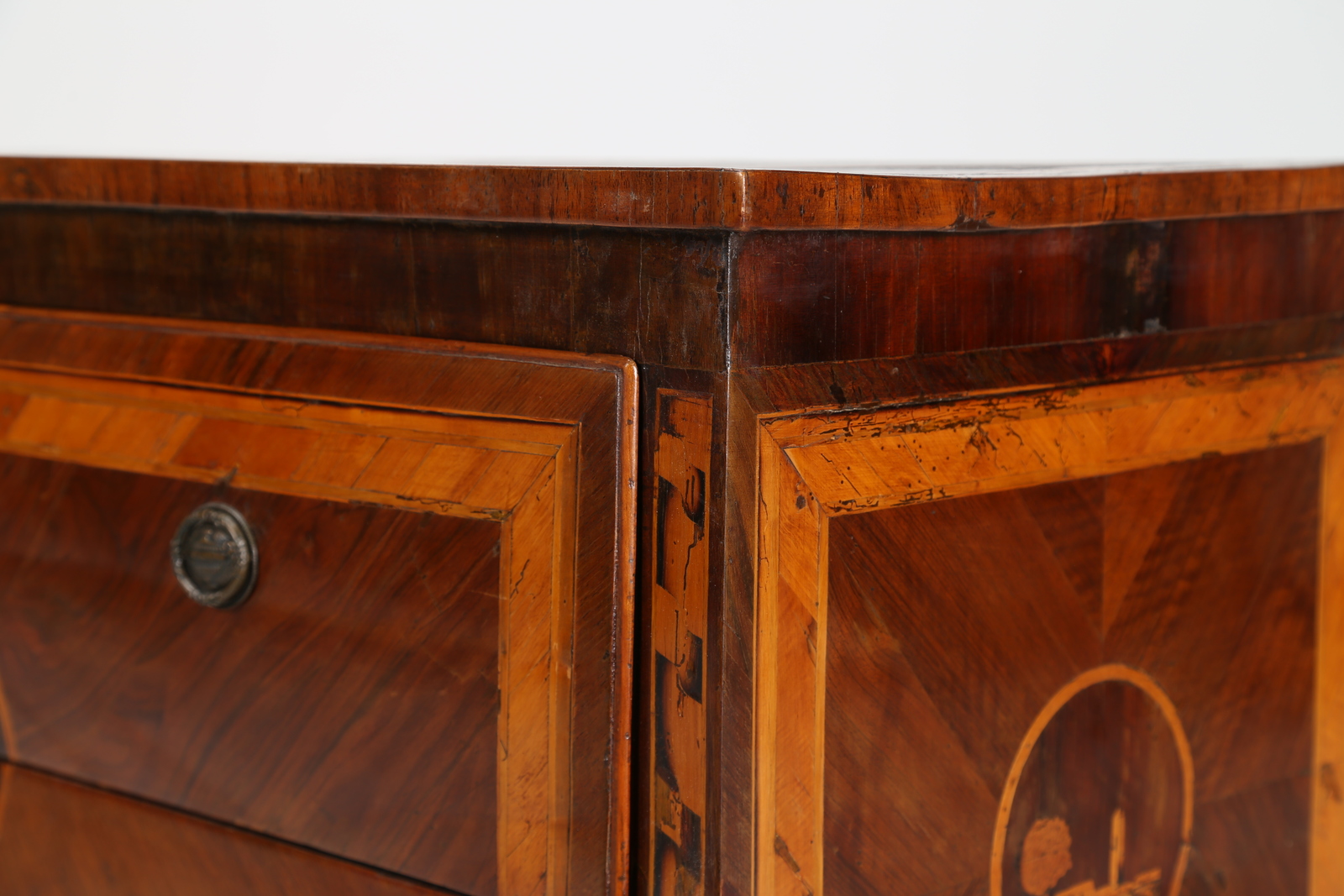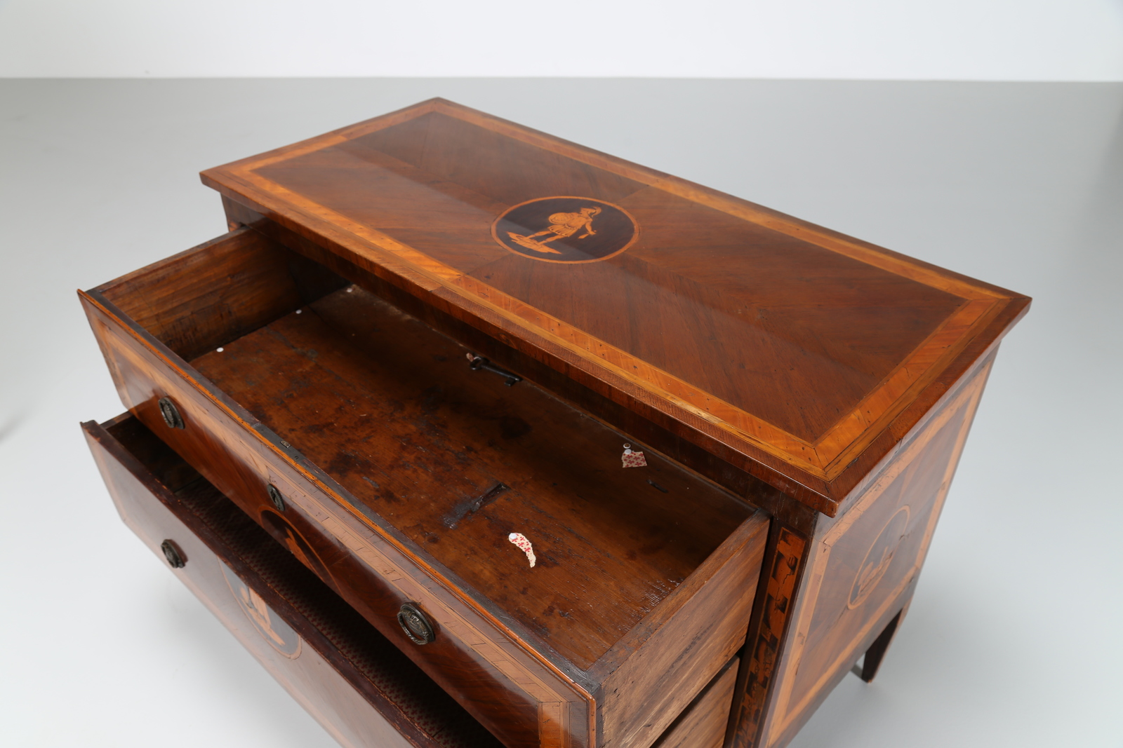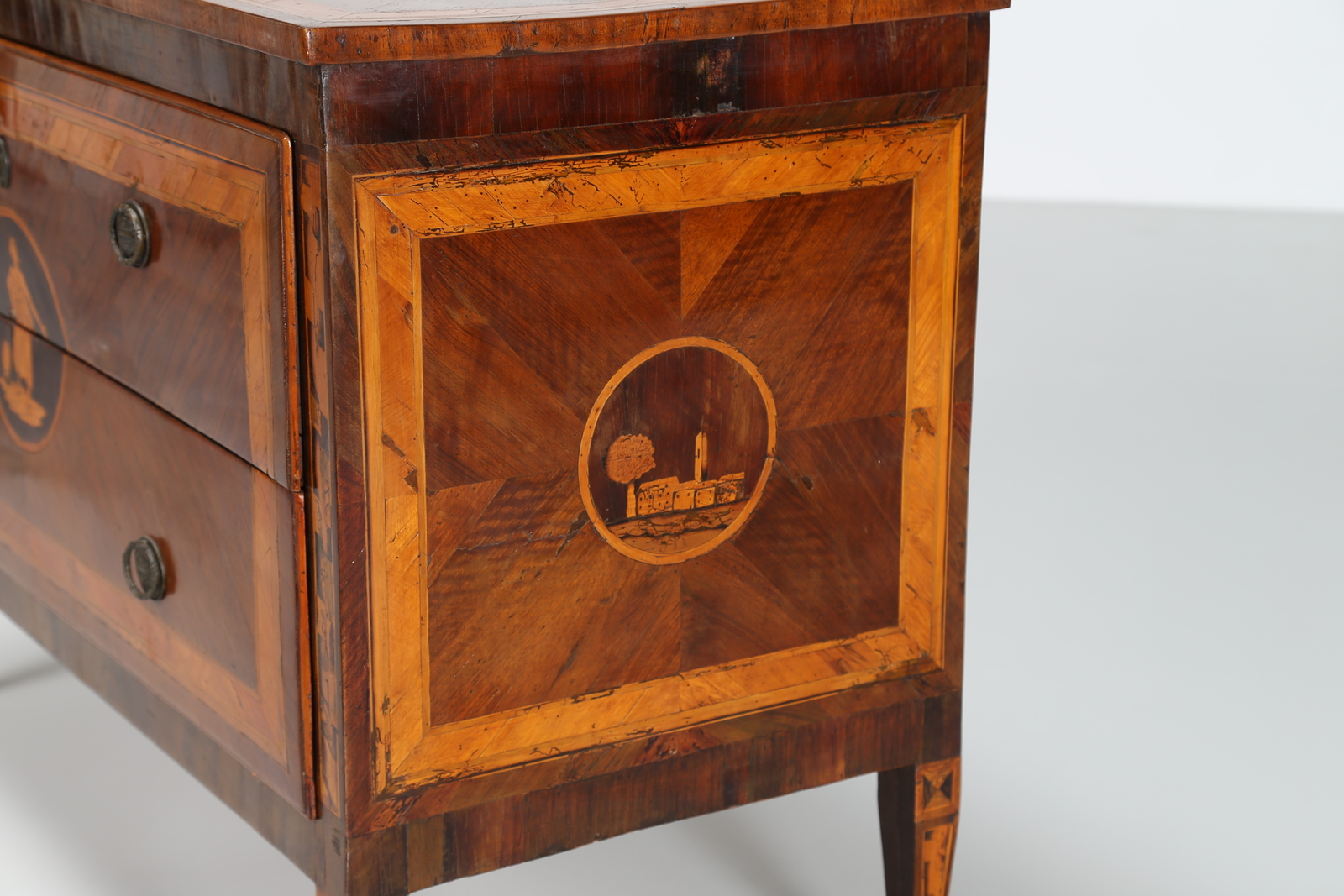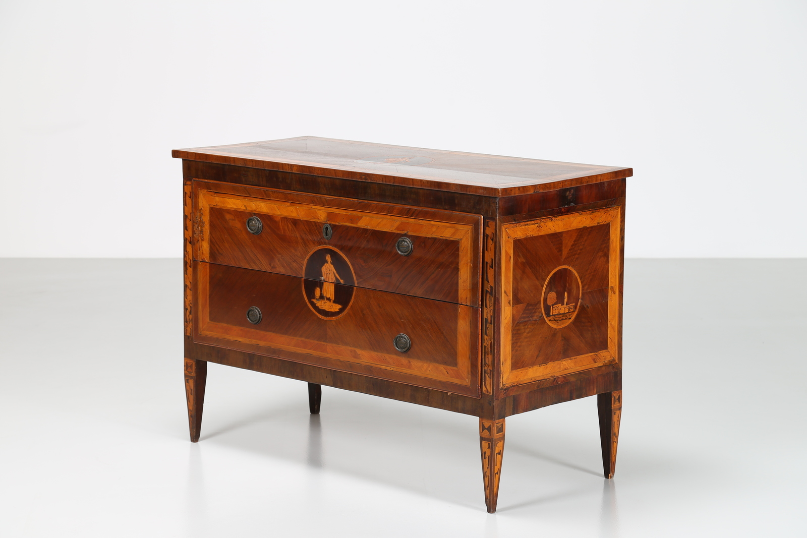 MANIFATTURA LOMBARDA DEL XVIII SECOLO Cassettone lastronato e intarsiato con figure classiche sul piano e sui fianchi. . Cm 116,00 x 81,00 x 52,00.